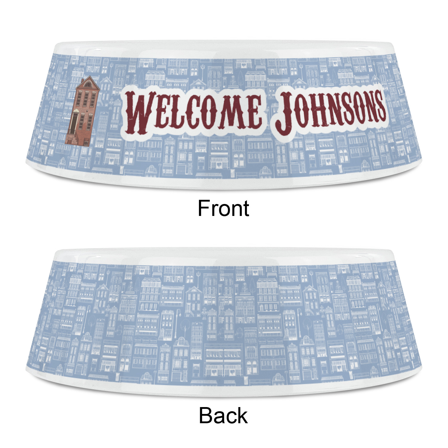 The design has two patterns with one surrounding the other in a square format. The inner pattern is a beautiful light-blue with white illustrations of houses and apartments. The outer design is a warm red brick pattern. The combination of these two patterns makes for a very friendly feeling design. The personalization goes directly in the middle of the inner design. The coordinating pattern has a fun colored graphic of a block of apartments and a place for text underneath.