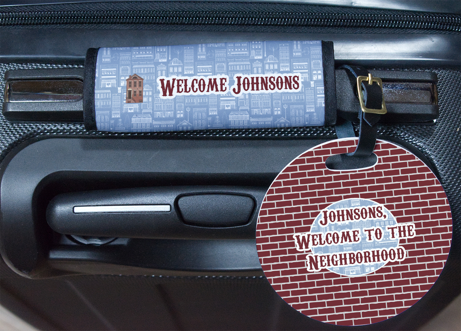 The design has two patterns with one surrounding the other in a square format. The inner pattern is a beautiful light-blue with white illustrations of houses and apartments. The outer design is a warm red brick pattern. The combination of these two patterns makes for a very friendly feeling design. The personalization goes directly in the middle of the inner design. The coordinating pattern has a fun colored graphic of a block of apartments and a place for text underneath.