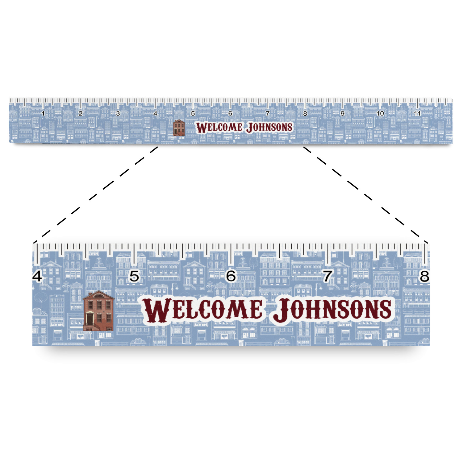 The design has two patterns with one surrounding the other in a square format. The inner pattern is a beautiful light-blue with white illustrations of houses and apartments. The outer design is a warm red brick pattern. The combination of these two patterns makes for a very friendly feeling design. The personalization goes directly in the middle of the inner design. The coordinating pattern has a fun colored graphic of a block of apartments and a place for text underneath.