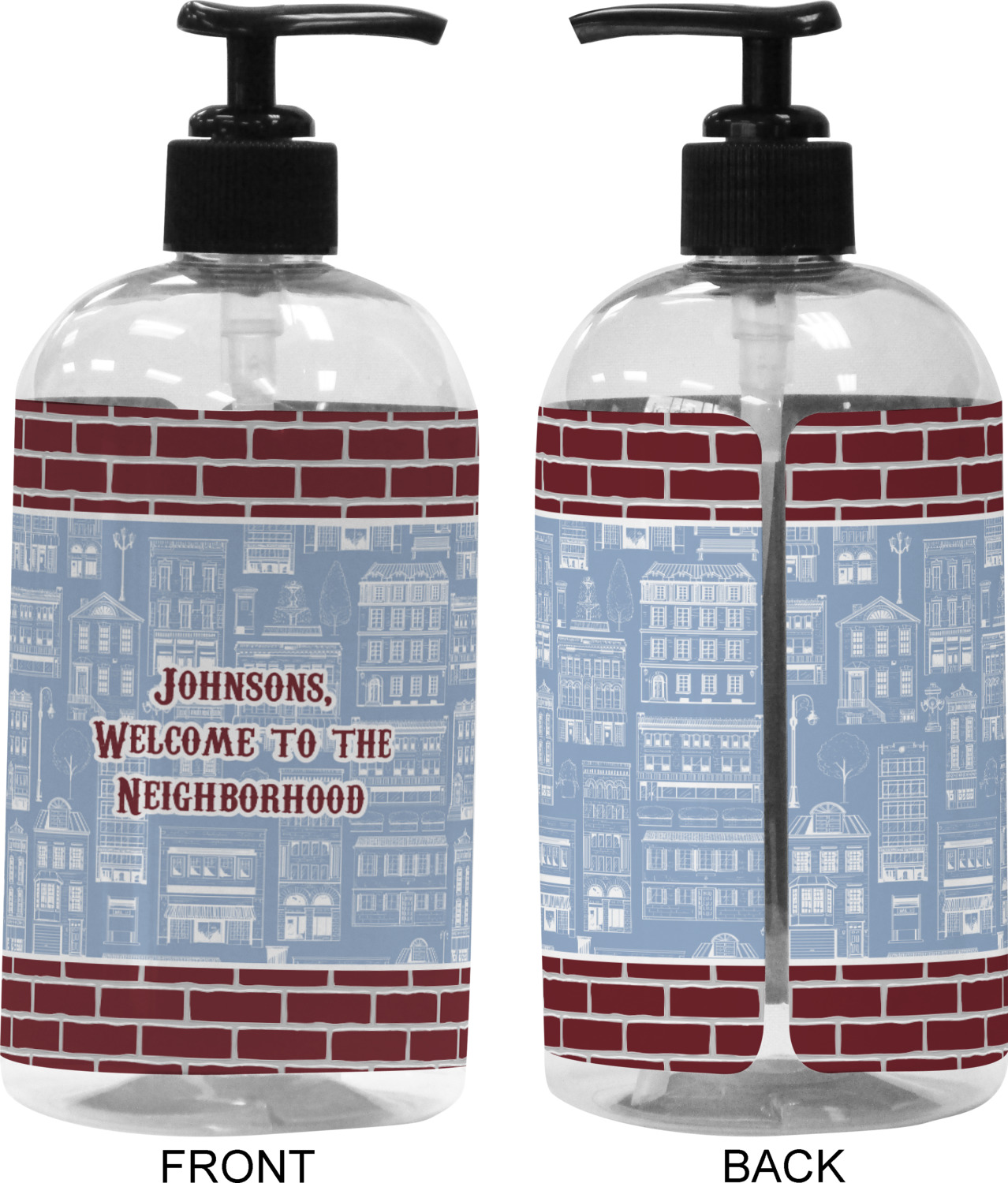 The design has two patterns with one surrounding the other in a square format. The inner pattern is a beautiful light-blue with white illustrations of houses and apartments. The outer design is a warm red brick pattern. The combination of these two patterns makes for a very friendly feeling design. The personalization goes directly in the middle of the inner design. The coordinating pattern has a fun colored graphic of a block of apartments and a place for text underneath.