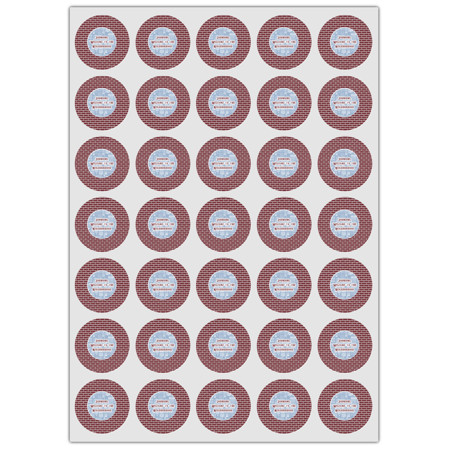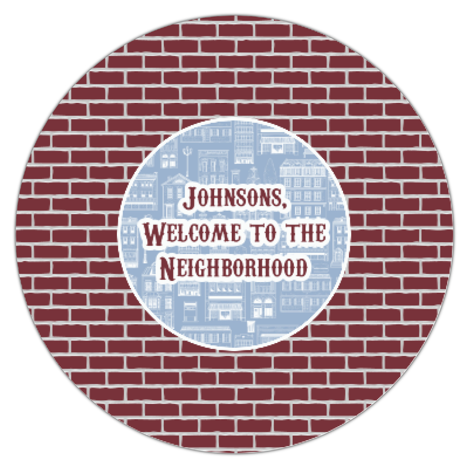 The design has two patterns with one surrounding the other in a square format. The inner pattern is a beautiful light-blue with white illustrations of houses and apartments. The outer design is a warm red brick pattern. The combination of these two patterns makes for a very friendly feeling design. The personalization goes directly in the middle of the inner design. The coordinating pattern has a fun colored graphic of a block of apartments and a place for text underneath.