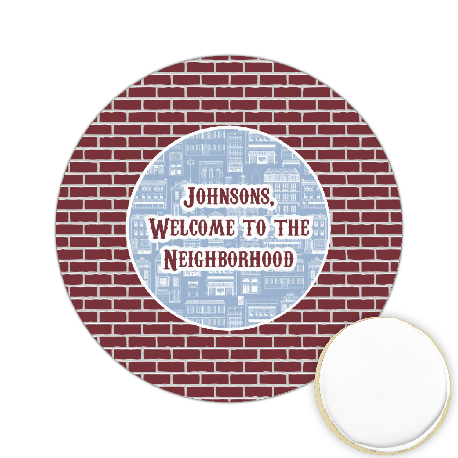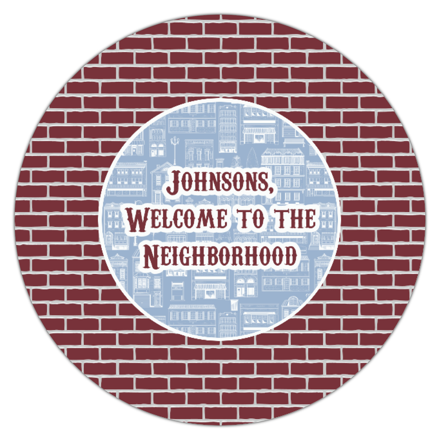 The design has two patterns with one surrounding the other in a square format. The inner pattern is a beautiful light-blue with white illustrations of houses and apartments. The outer design is a warm red brick pattern. The combination of these two patterns makes for a very friendly feeling design. The personalization goes directly in the middle of the inner design. The coordinating pattern has a fun colored graphic of a block of apartments and a place for text underneath.