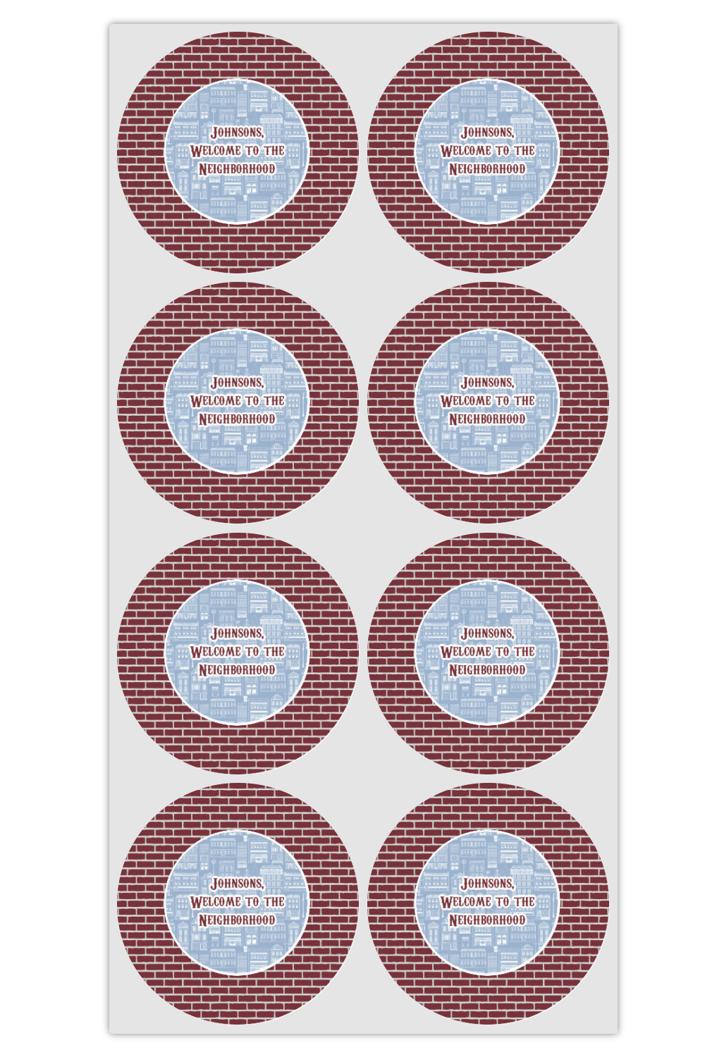 The design has two patterns with one surrounding the other in a square format. The inner pattern is a beautiful light-blue with white illustrations of houses and apartments. The outer design is a warm red brick pattern. The combination of these two patterns makes for a very friendly feeling design. The personalization goes directly in the middle of the inner design. The coordinating pattern has a fun colored graphic of a block of apartments and a place for text underneath.