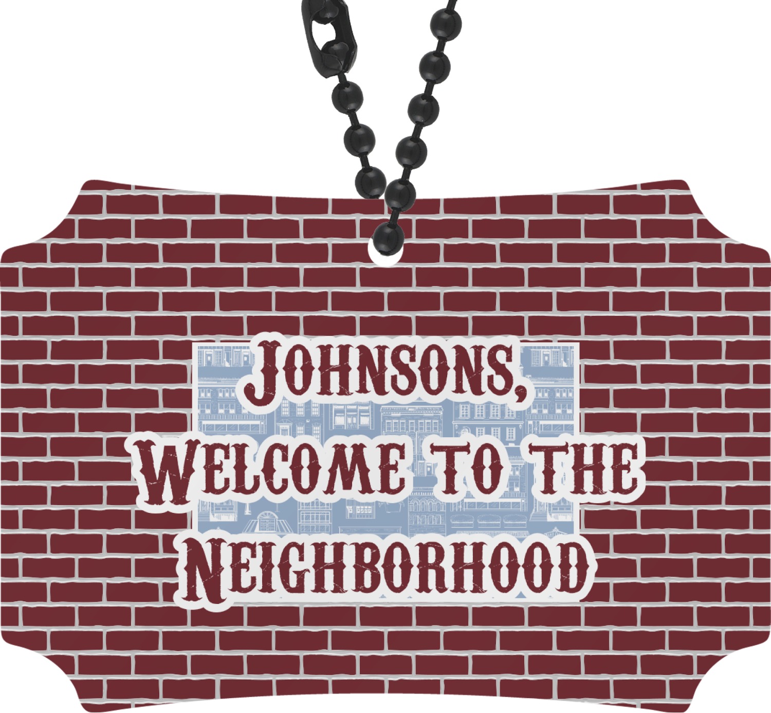 The design has two patterns with one surrounding the other in a square format. The inner pattern is a beautiful light-blue with white illustrations of houses and apartments. The outer design is a warm red brick pattern. The combination of these two patterns makes for a very friendly feeling design. The personalization goes directly in the middle of the inner design. The coordinating pattern has a fun colored graphic of a block of apartments and a place for text underneath.