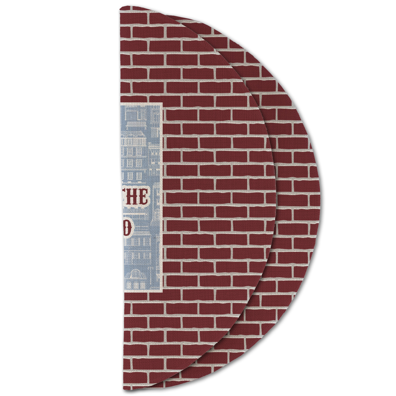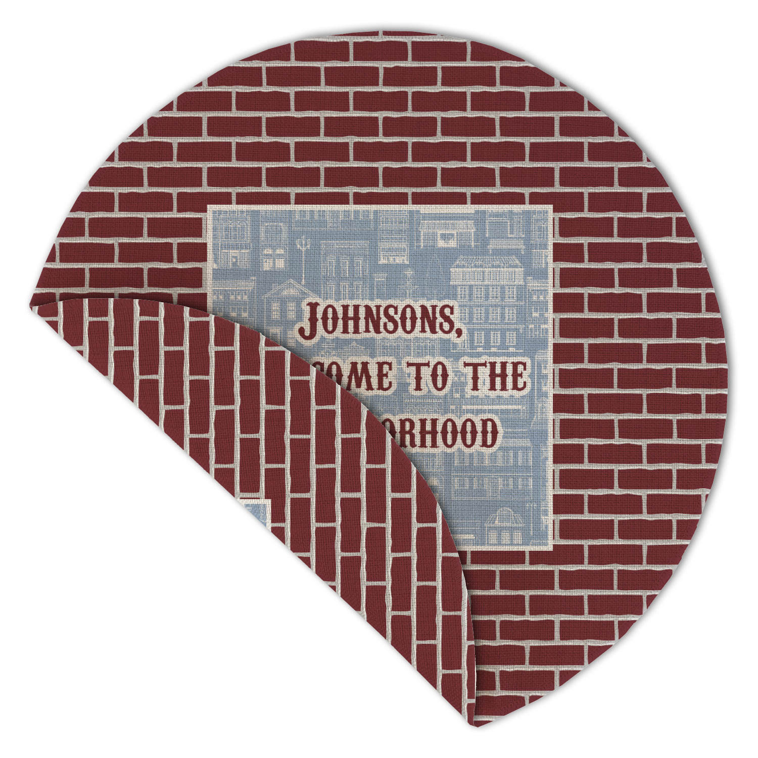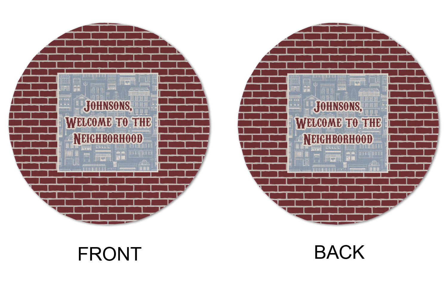 The design has two patterns with one surrounding the other in a square format. The inner pattern is a beautiful light-blue with white illustrations of houses and apartments. The outer design is a warm red brick pattern. The combination of these two patterns makes for a very friendly feeling design. The personalization goes directly in the middle of the inner design. The coordinating pattern has a fun colored graphic of a block of apartments and a place for text underneath.