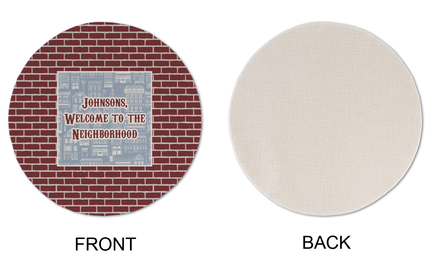The design has two patterns with one surrounding the other in a square format. The inner pattern is a beautiful light-blue with white illustrations of houses and apartments. The outer design is a warm red brick pattern. The combination of these two patterns makes for a very friendly feeling design. The personalization goes directly in the middle of the inner design. The coordinating pattern has a fun colored graphic of a block of apartments and a place for text underneath.