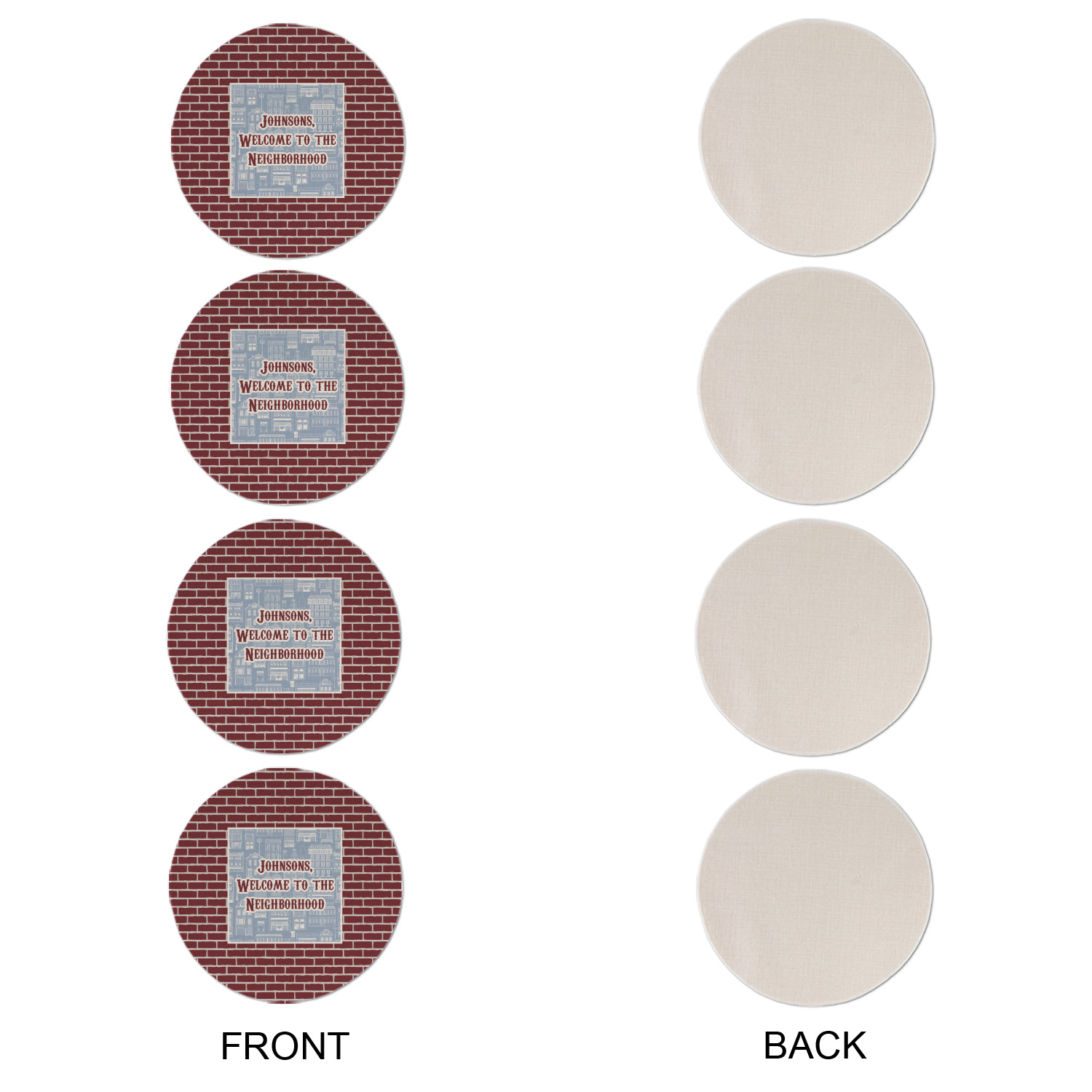 The design has two patterns with one surrounding the other in a square format. The inner pattern is a beautiful light-blue with white illustrations of houses and apartments. The outer design is a warm red brick pattern. The combination of these two patterns makes for a very friendly feeling design. The personalization goes directly in the middle of the inner design. The coordinating pattern has a fun colored graphic of a block of apartments and a place for text underneath.