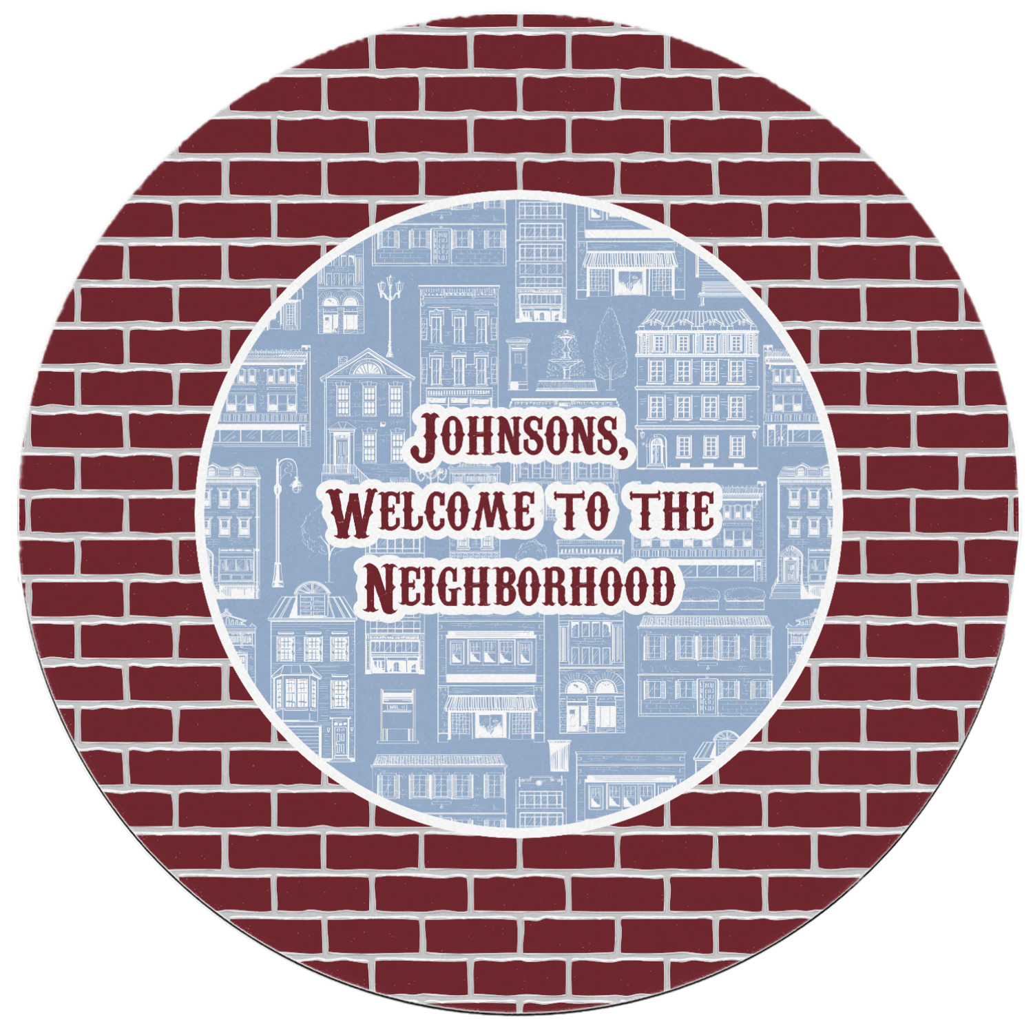 The design has two patterns with one surrounding the other in a square format. The inner pattern is a beautiful light-blue with white illustrations of houses and apartments. The outer design is a warm red brick pattern. The combination of these two patterns makes for a very friendly feeling design. The personalization goes directly in the middle of the inner design. The coordinating pattern has a fun colored graphic of a block of apartments and a place for text underneath.