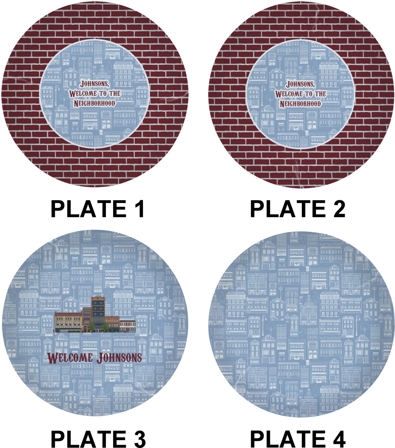 The design has two patterns with one surrounding the other in a square format. The inner pattern is a beautiful light-blue with white illustrations of houses and apartments. The outer design is a warm red brick pattern. The combination of these two patterns makes for a very friendly feeling design. The personalization goes directly in the middle of the inner design. The coordinating pattern has a fun colored graphic of a block of apartments and a place for text underneath.