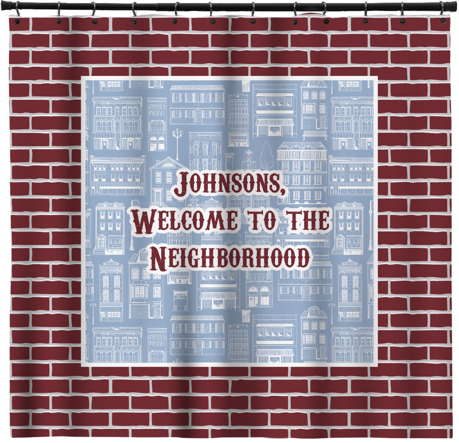 The design has two patterns with one surrounding the other in a square format. The inner pattern is a beautiful light-blue with white illustrations of houses and apartments. The outer design is a warm red brick pattern. The combination of these two patterns makes for a very friendly feeling design. The personalization goes directly in the middle of the inner design. The coordinating pattern has a fun colored graphic of a block of apartments and a place for text underneath.