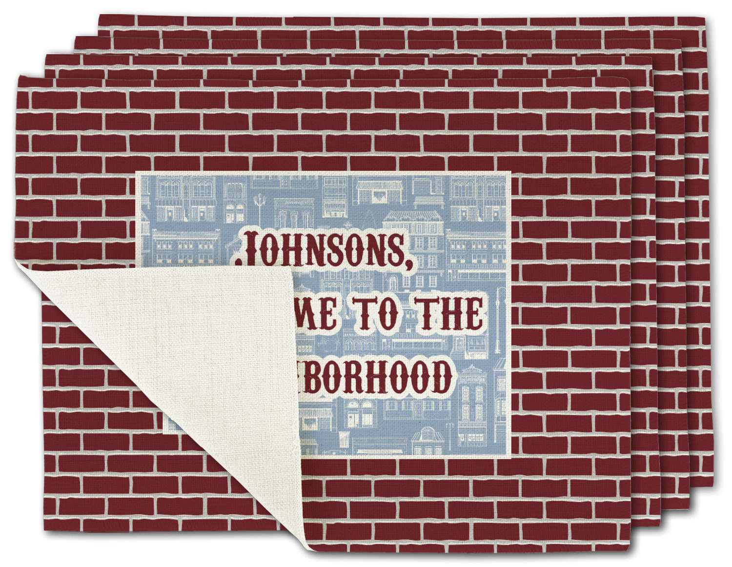The design has two patterns with one surrounding the other in a square format. The inner pattern is a beautiful light-blue with white illustrations of houses and apartments. The outer design is a warm red brick pattern. The combination of these two patterns makes for a very friendly feeling design. The personalization goes directly in the middle of the inner design. The coordinating pattern has a fun colored graphic of a block of apartments and a place for text underneath.