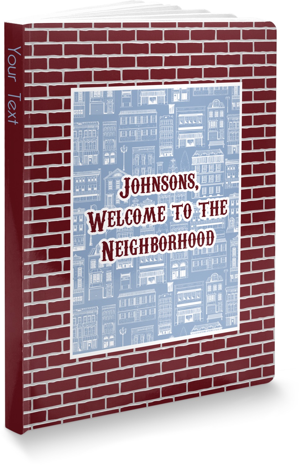 The design has two patterns with one surrounding the other in a square format. The inner pattern is a beautiful light-blue with white illustrations of houses and apartments. The outer design is a warm red brick pattern. The combination of these two patterns makes for a very friendly feeling design. The personalization goes directly in the middle of the inner design. The coordinating pattern has a fun colored graphic of a block of apartments and a place for text underneath.