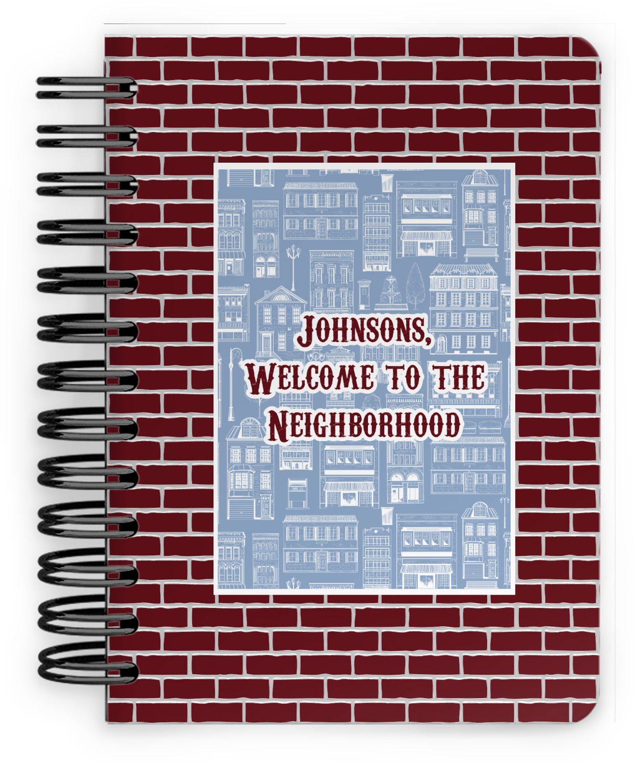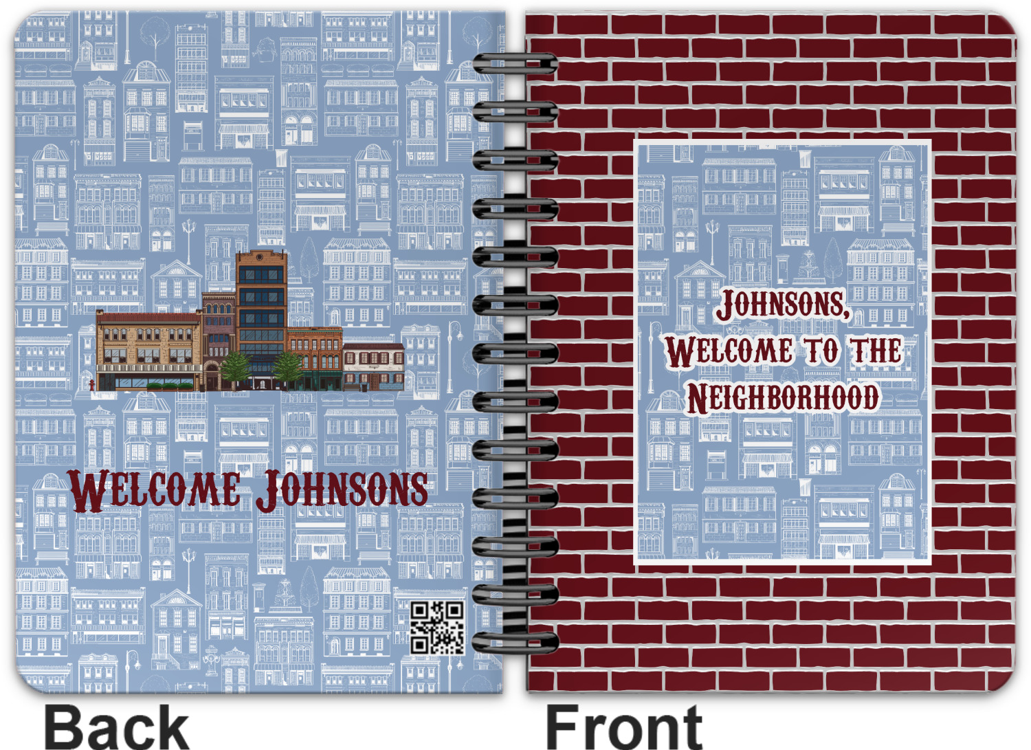 The design has two patterns with one surrounding the other in a square format. The inner pattern is a beautiful light-blue with white illustrations of houses and apartments. The outer design is a warm red brick pattern. The combination of these two patterns makes for a very friendly feeling design. The personalization goes directly in the middle of the inner design. The coordinating pattern has a fun colored graphic of a block of apartments and a place for text underneath.