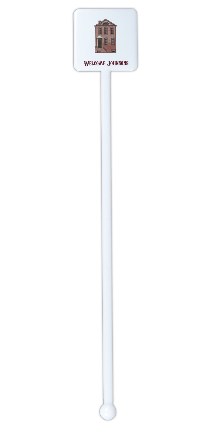 The design has two patterns with one surrounding the other in a square format. The inner pattern is a beautiful light-blue with white illustrations of houses and apartments. The outer design is a warm red brick pattern. The combination of these two patterns makes for a very friendly feeling design. The personalization goes directly in the middle of the inner design. The coordinating pattern has a fun colored graphic of a block of apartments and a place for text underneath.
