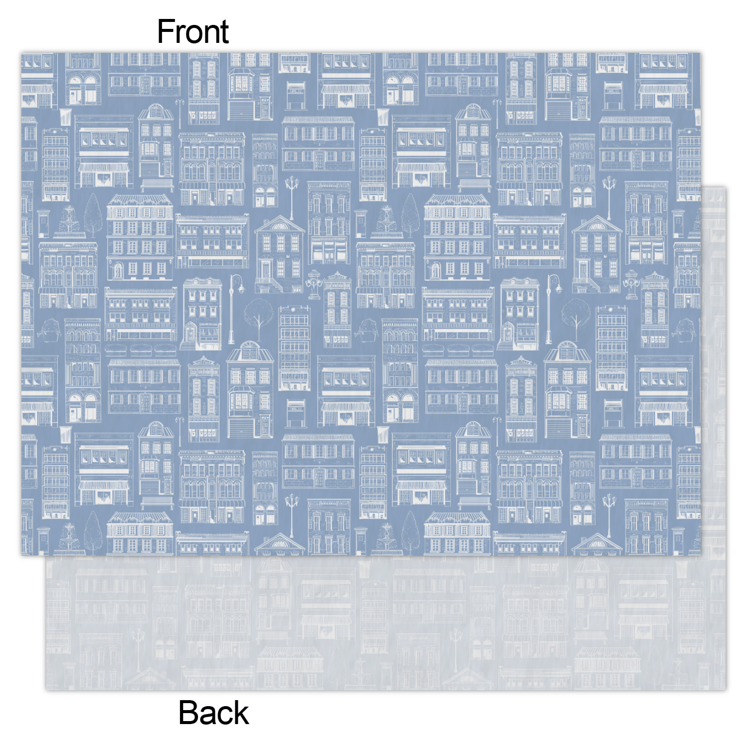 The design has two patterns with one surrounding the other in a square format. The inner pattern is a beautiful light-blue with white illustrations of houses and apartments. The outer design is a warm red brick pattern. The combination of these two patterns makes for a very friendly feeling design. The personalization goes directly in the middle of the inner design. The coordinating pattern has a fun colored graphic of a block of apartments and a place for text underneath.