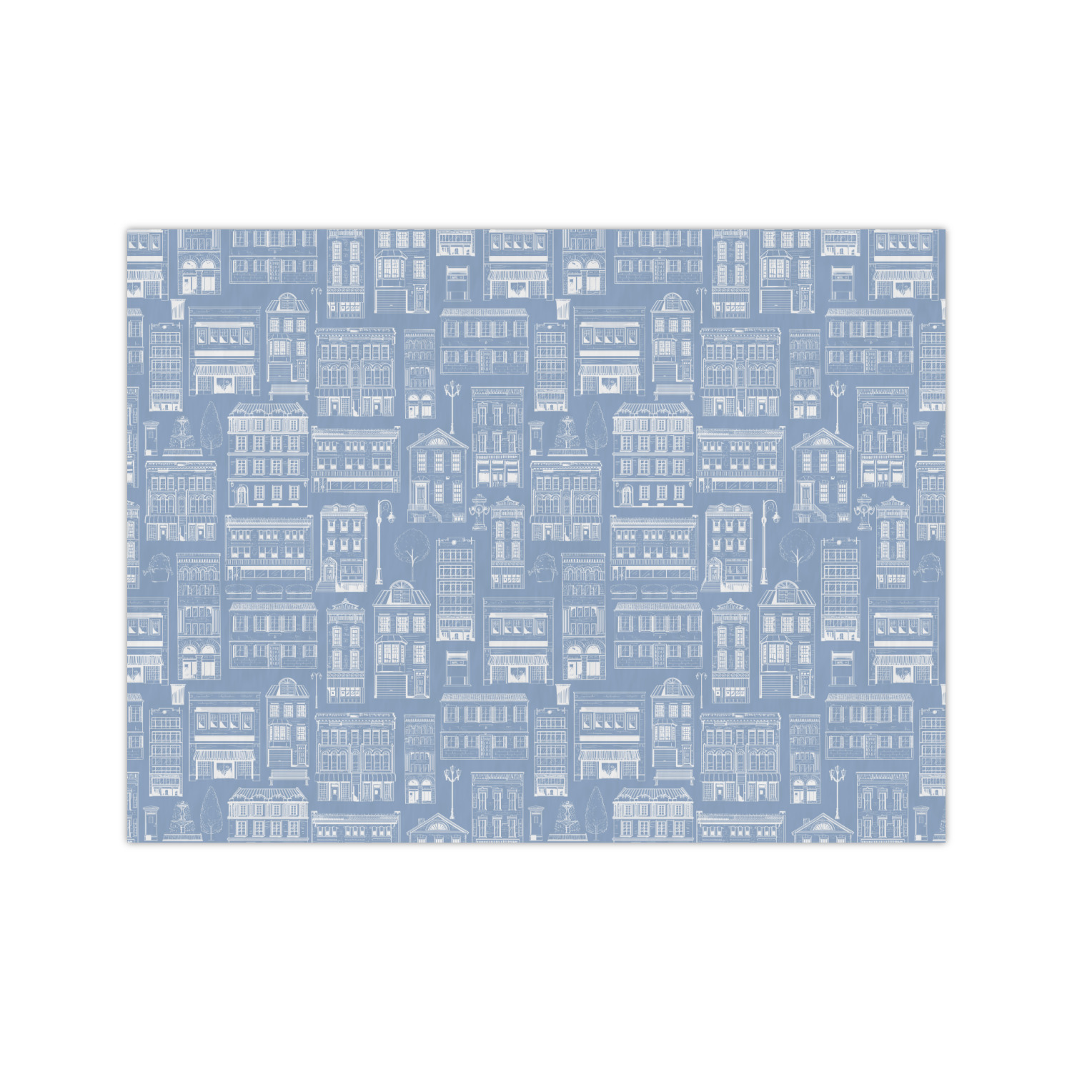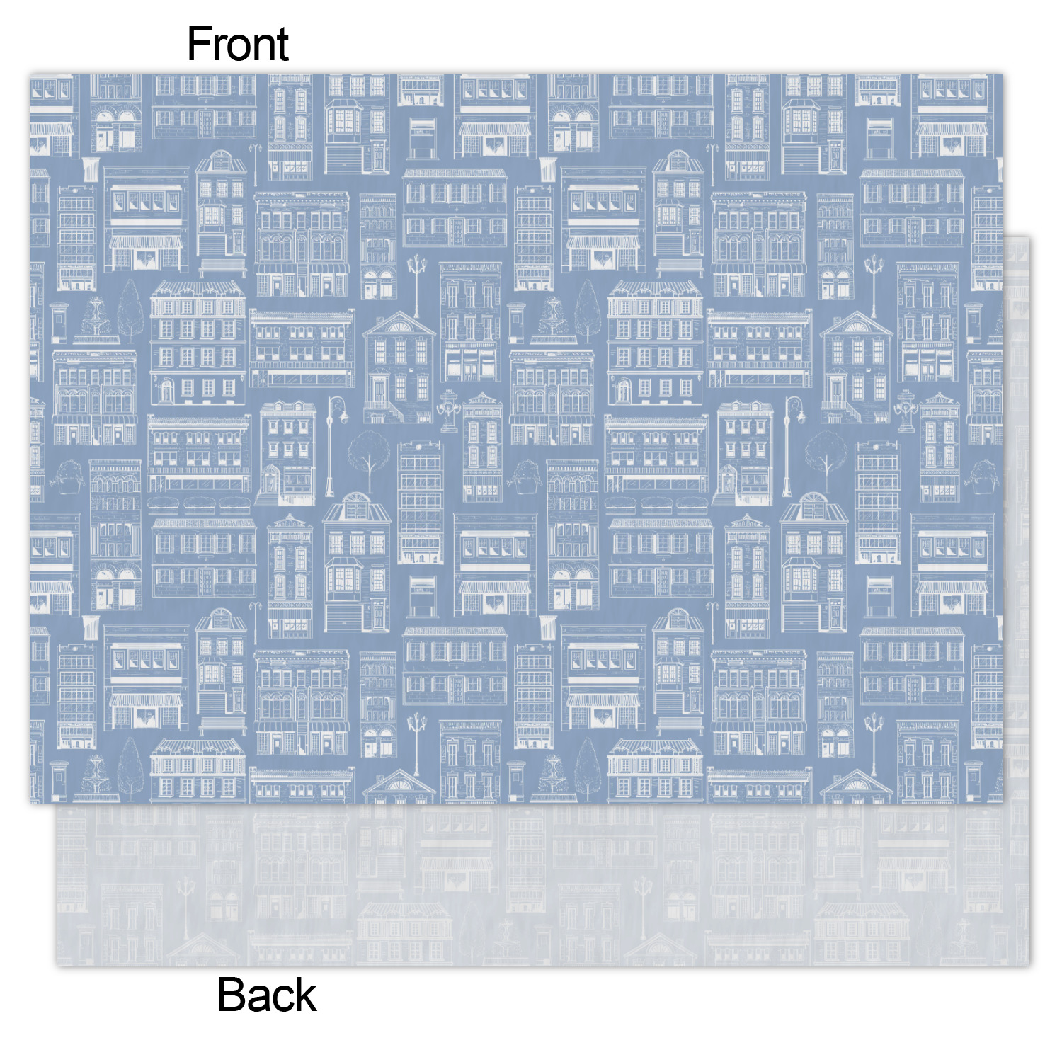 The design has two patterns with one surrounding the other in a square format. The inner pattern is a beautiful light-blue with white illustrations of houses and apartments. The outer design is a warm red brick pattern. The combination of these two patterns makes for a very friendly feeling design. The personalization goes directly in the middle of the inner design. The coordinating pattern has a fun colored graphic of a block of apartments and a place for text underneath.