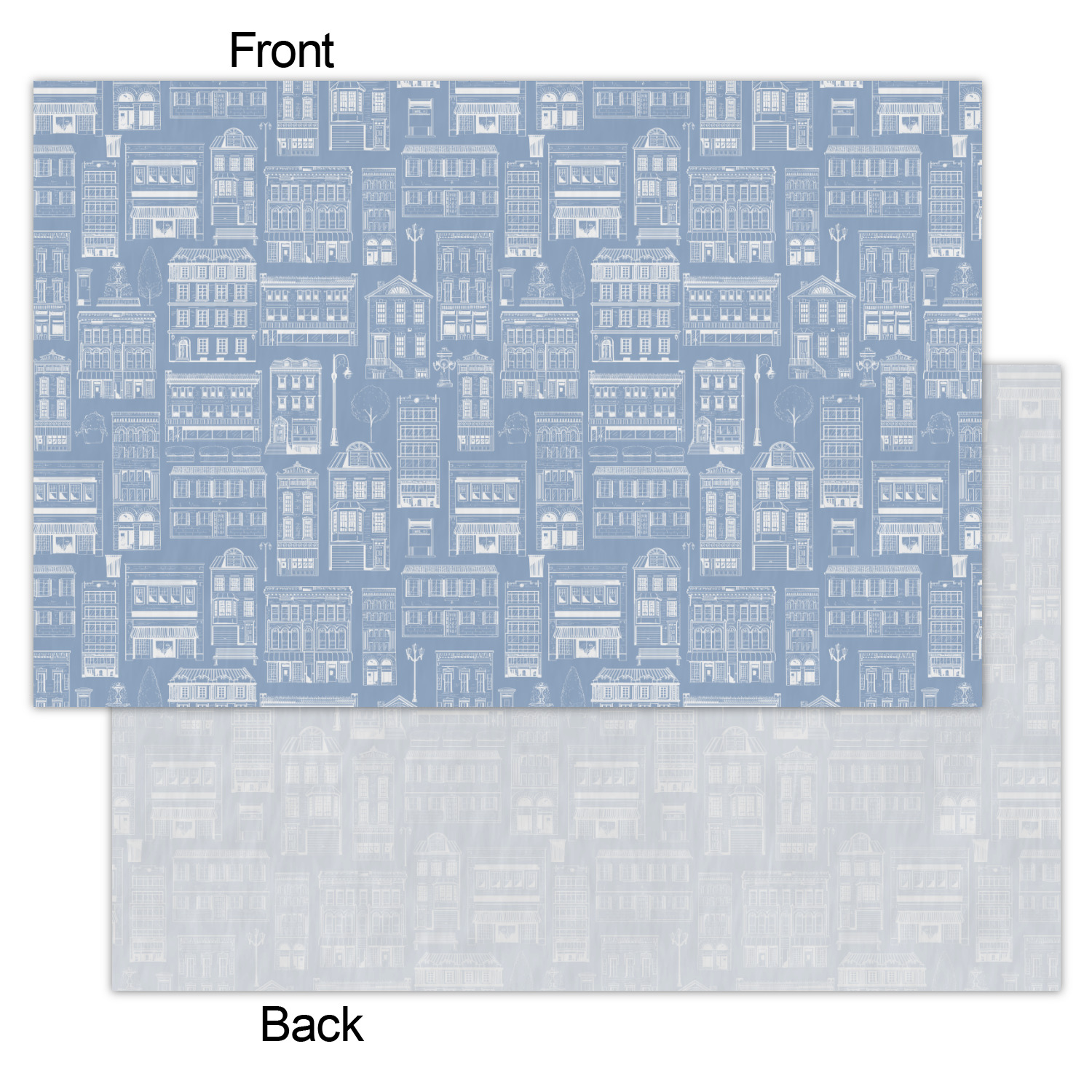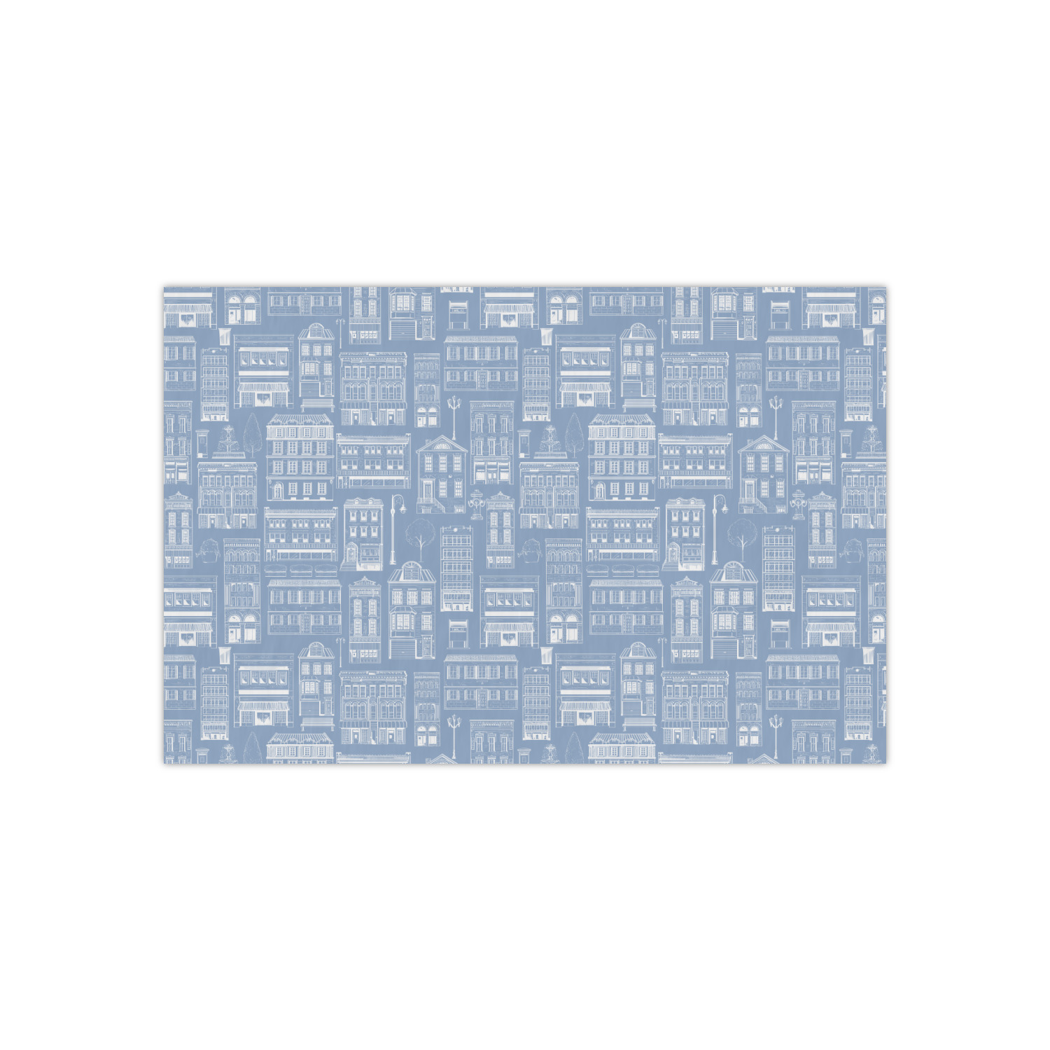The design has two patterns with one surrounding the other in a square format. The inner pattern is a beautiful light-blue with white illustrations of houses and apartments. The outer design is a warm red brick pattern. The combination of these two patterns makes for a very friendly feeling design. The personalization goes directly in the middle of the inner design. The coordinating pattern has a fun colored graphic of a block of apartments and a place for text underneath.