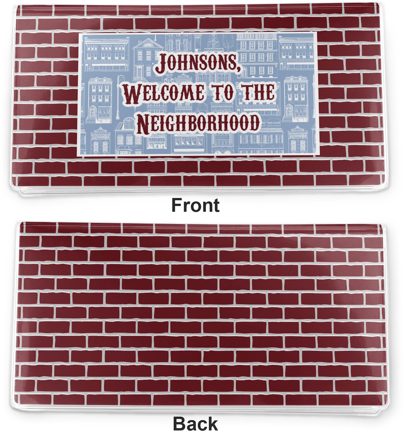 The design has two patterns with one surrounding the other in a square format. The inner pattern is a beautiful light-blue with white illustrations of houses and apartments. The outer design is a warm red brick pattern. The combination of these two patterns makes for a very friendly feeling design. The personalization goes directly in the middle of the inner design. The coordinating pattern has a fun colored graphic of a block of apartments and a place for text underneath.