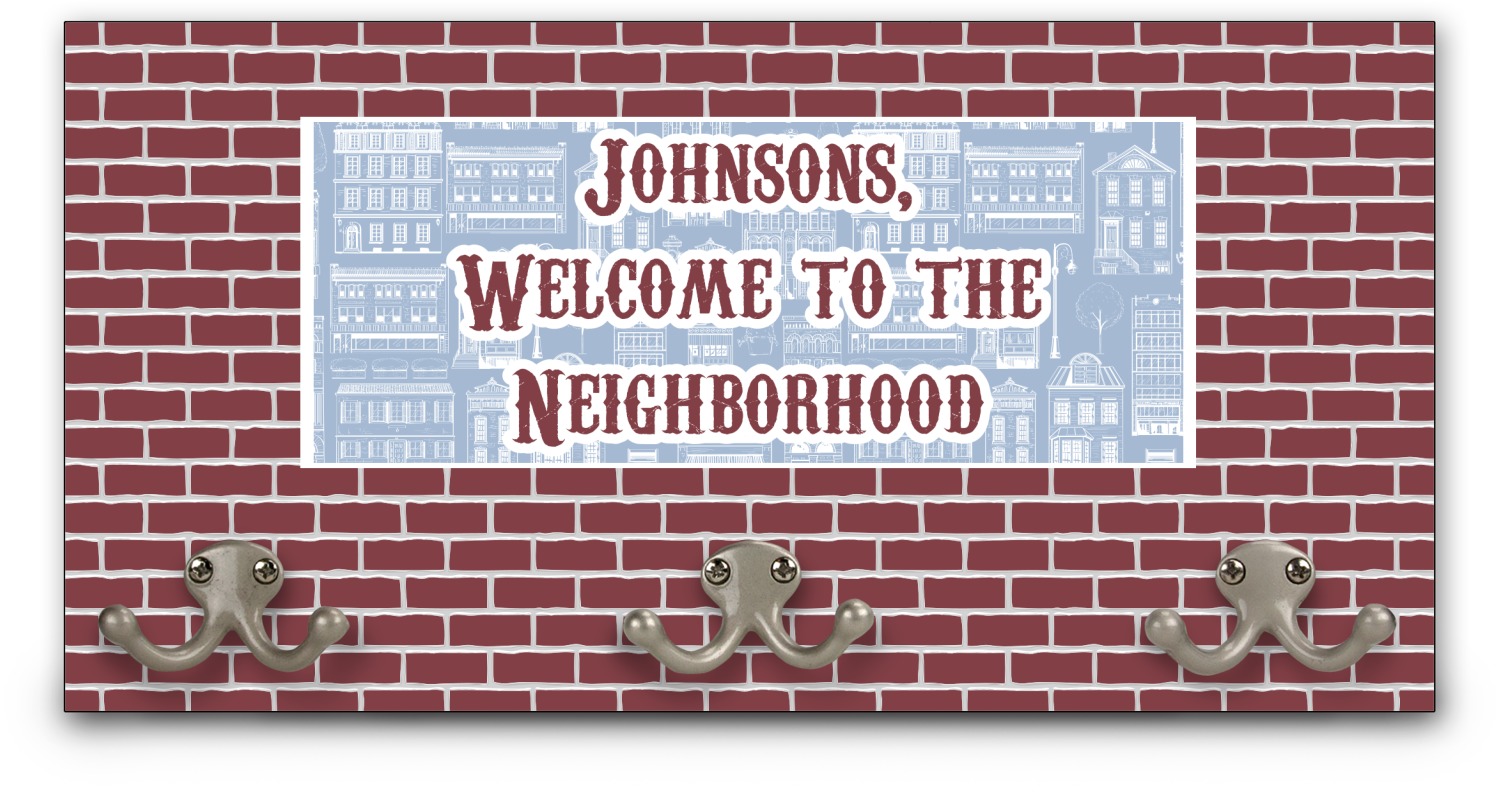 The design has two patterns with one surrounding the other in a square format. The inner pattern is a beautiful light-blue with white illustrations of houses and apartments. The outer design is a warm red brick pattern. The combination of these two patterns makes for a very friendly feeling design. The personalization goes directly in the middle of the inner design. The coordinating pattern has a fun colored graphic of a block of apartments and a place for text underneath.
