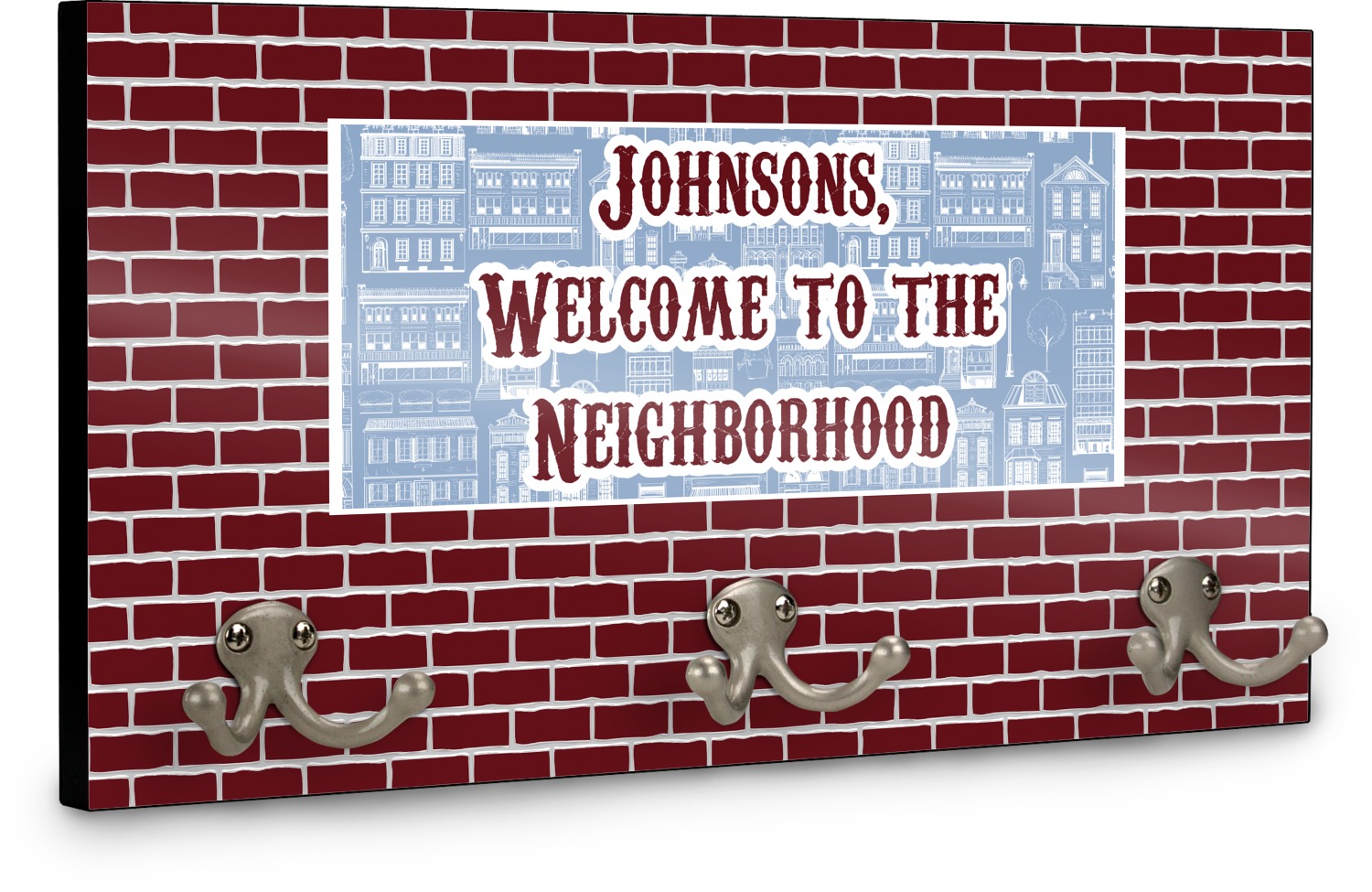 This coat rack is the perfect way to add some personality to your wall or entryway. The board is made of a strong maple that is approximately 16" x 8". The three 2-prong hooks are a sturdy metal that have two screws attaching them to the board. Your design is printed right onto the front of the board while the back and sides are a simple black.