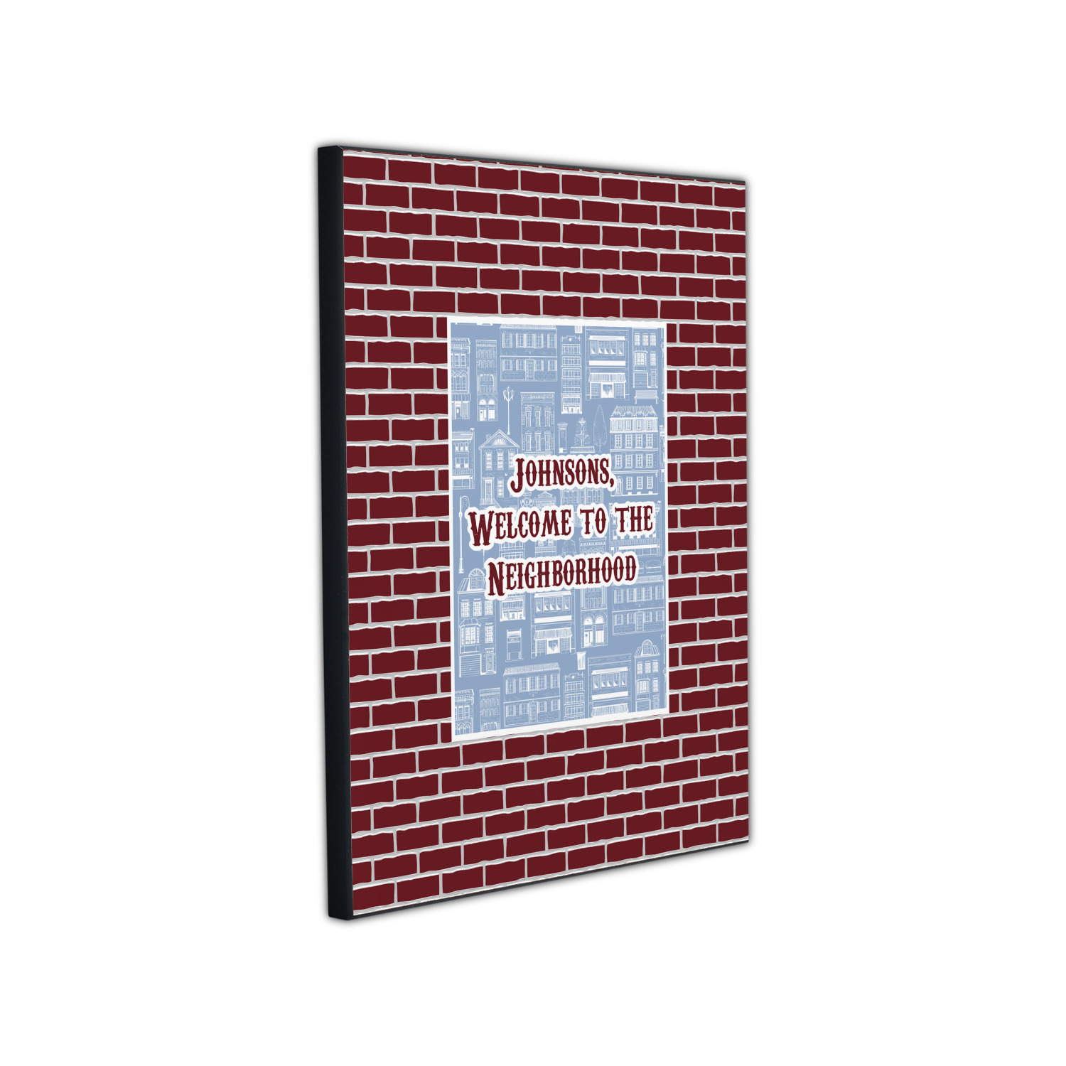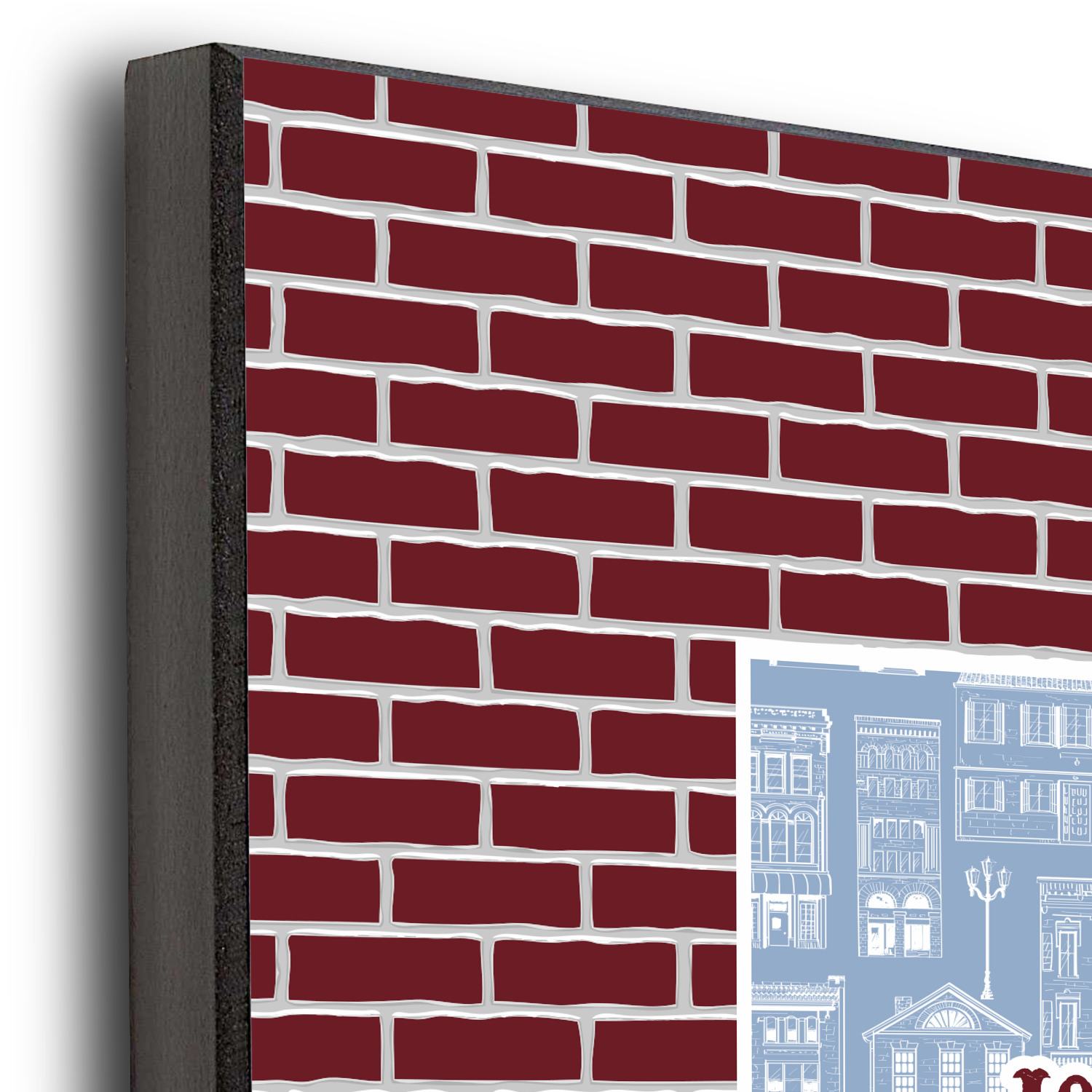 The design has two patterns with one surrounding the other in a square format. The inner pattern is a beautiful light-blue with white illustrations of houses and apartments. The outer design is a warm red brick pattern. The combination of these two patterns makes for a very friendly feeling design. The personalization goes directly in the middle of the inner design. The coordinating pattern has a fun colored graphic of a block of apartments and a place for text underneath.