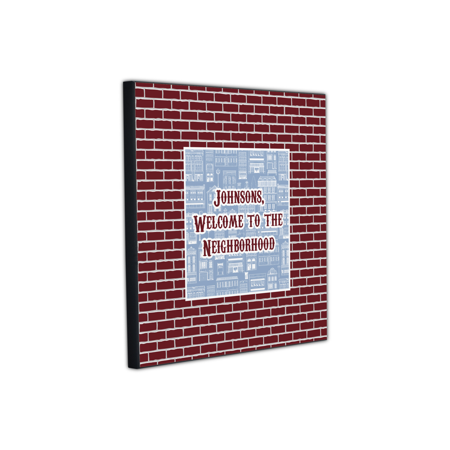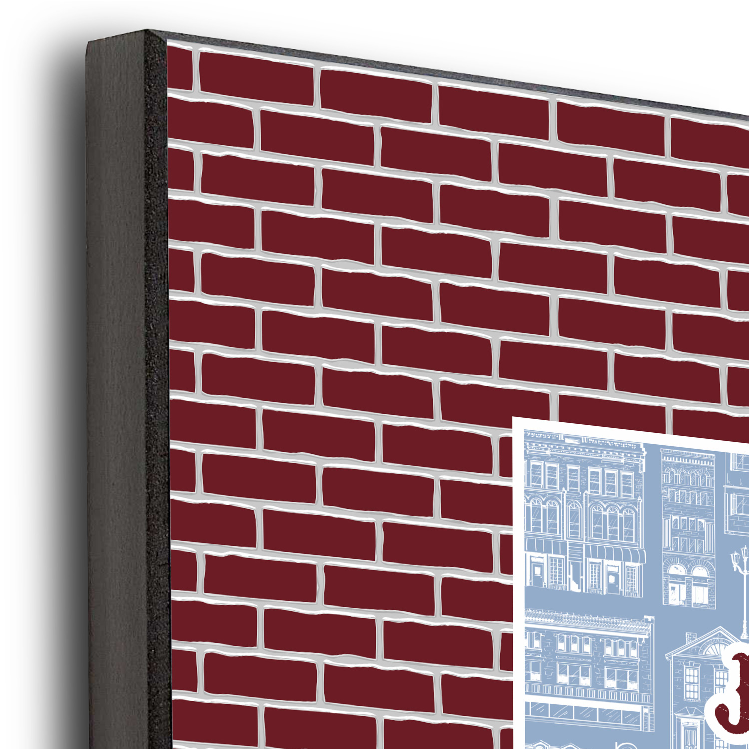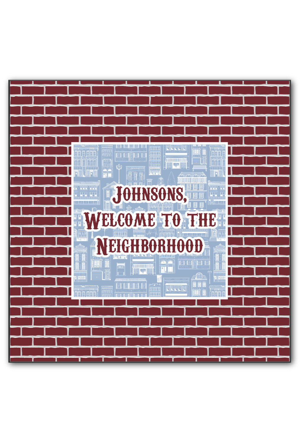 The design has two patterns with one surrounding the other in a square format. The inner pattern is a beautiful light-blue with white illustrations of houses and apartments. The outer design is a warm red brick pattern. The combination of these two patterns makes for a very friendly feeling design. The personalization goes directly in the middle of the inner design. The coordinating pattern has a fun colored graphic of a block of apartments and a place for text underneath.