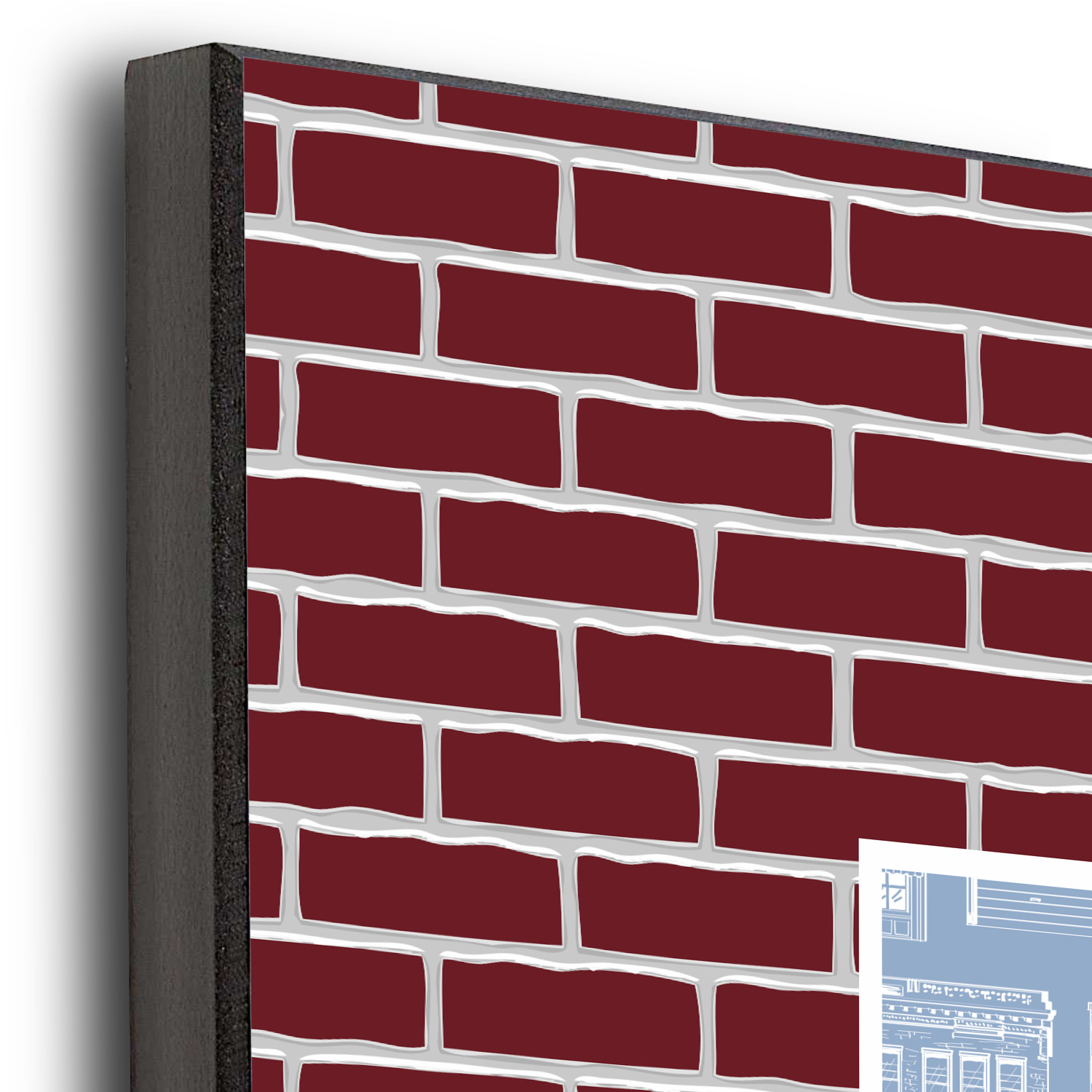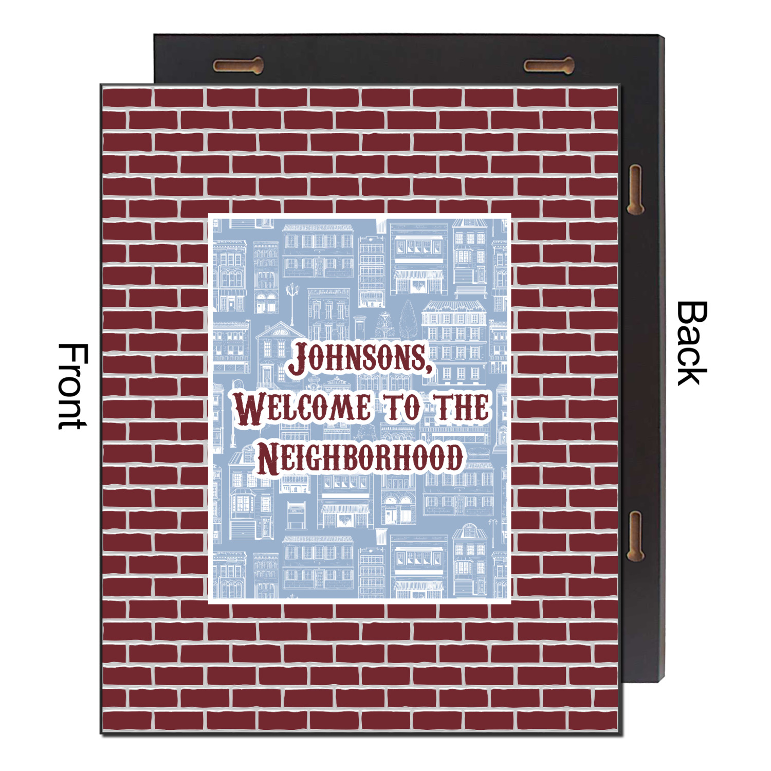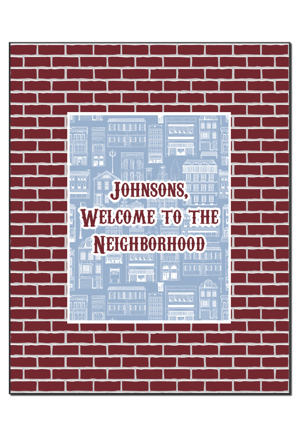 The design has two patterns with one surrounding the other in a square format. The inner pattern is a beautiful light-blue with white illustrations of houses and apartments. The outer design is a warm red brick pattern. The combination of these two patterns makes for a very friendly feeling design. The personalization goes directly in the middle of the inner design. The coordinating pattern has a fun colored graphic of a block of apartments and a place for text underneath.