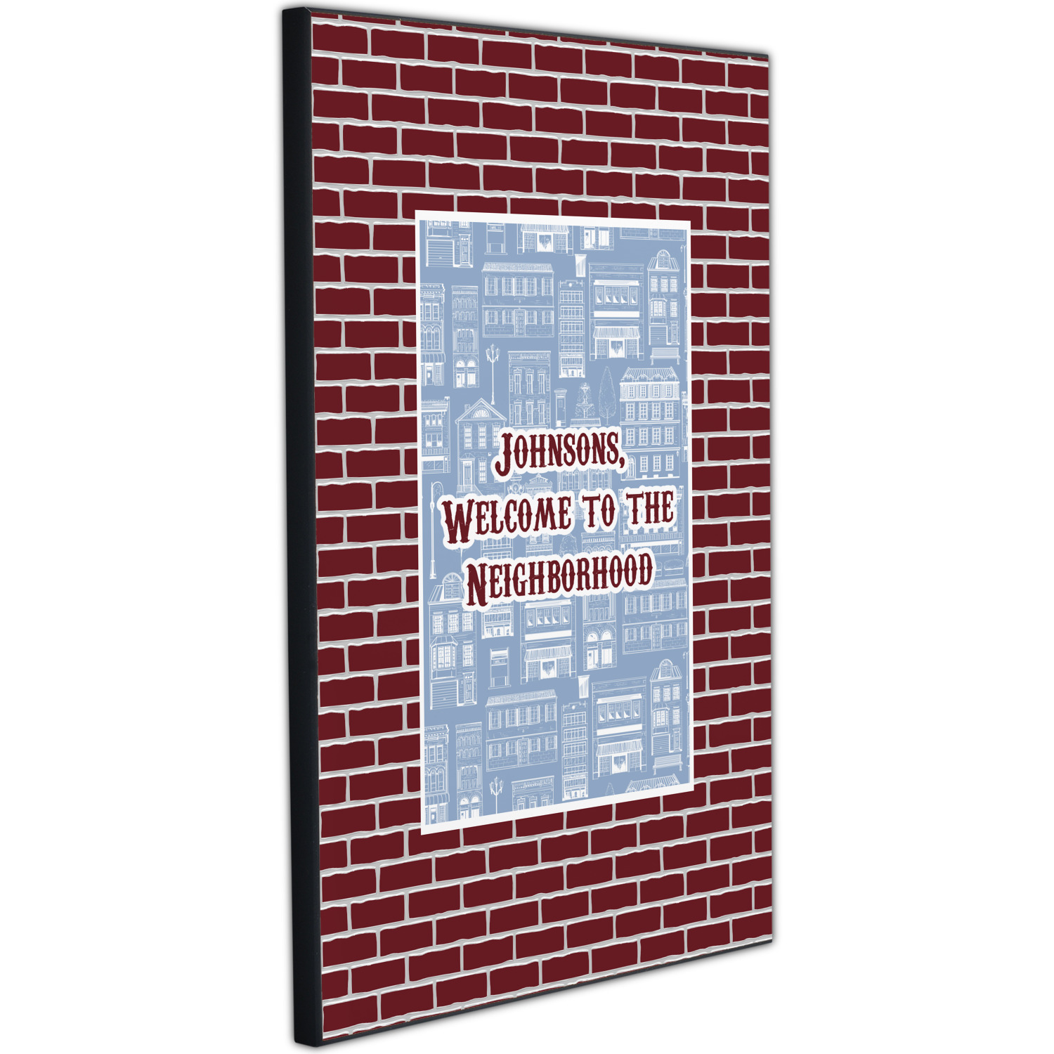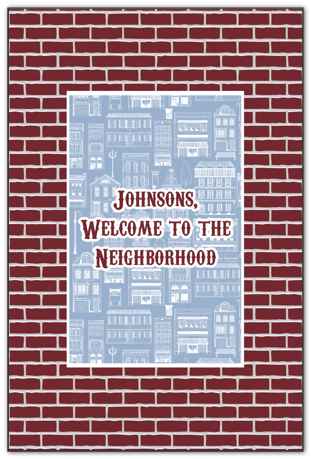 The design has two patterns with one surrounding the other in a square format. The inner pattern is a beautiful light-blue with white illustrations of houses and apartments. The outer design is a warm red brick pattern. The combination of these two patterns makes for a very friendly feeling design. The personalization goes directly in the middle of the inner design. The coordinating pattern has a fun colored graphic of a block of apartments and a place for text underneath.