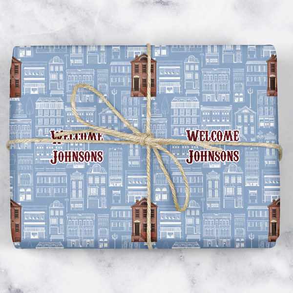 The design has two patterns with one surrounding the other in a square format. The inner pattern is a beautiful light-blue with white illustrations of houses and apartments. The outer design is a warm red brick pattern. The combination of these two patterns makes for a very friendly feeling design. The personalization goes directly in the middle of the inner design. The coordinating pattern has a fun colored graphic of a block of apartments and a place for text underneath.