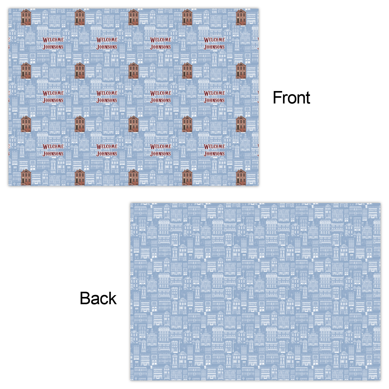 The design has two patterns with one surrounding the other in a square format. The inner pattern is a beautiful light-blue with white illustrations of houses and apartments. The outer design is a warm red brick pattern. The combination of these two patterns makes for a very friendly feeling design. The personalization goes directly in the middle of the inner design. The coordinating pattern has a fun colored graphic of a block of apartments and a place for text underneath.