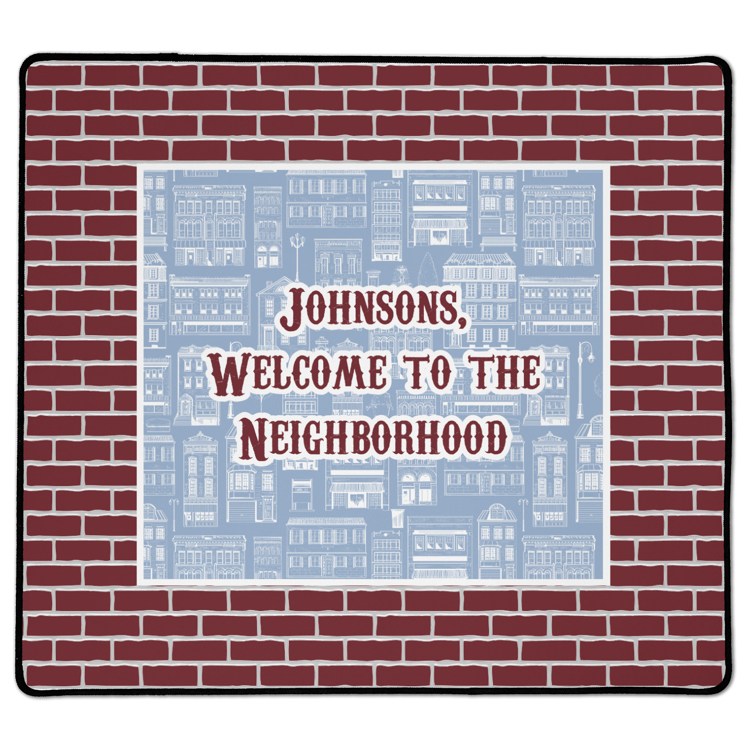 The design has two patterns with one surrounding the other in a square format. The inner pattern is a beautiful light-blue with white illustrations of houses and apartments. The outer design is a warm red brick pattern. The combination of these two patterns makes for a very friendly feeling design. The personalization goes directly in the middle of the inner design. The coordinating pattern has a fun colored graphic of a block of apartments and a place for text underneath.