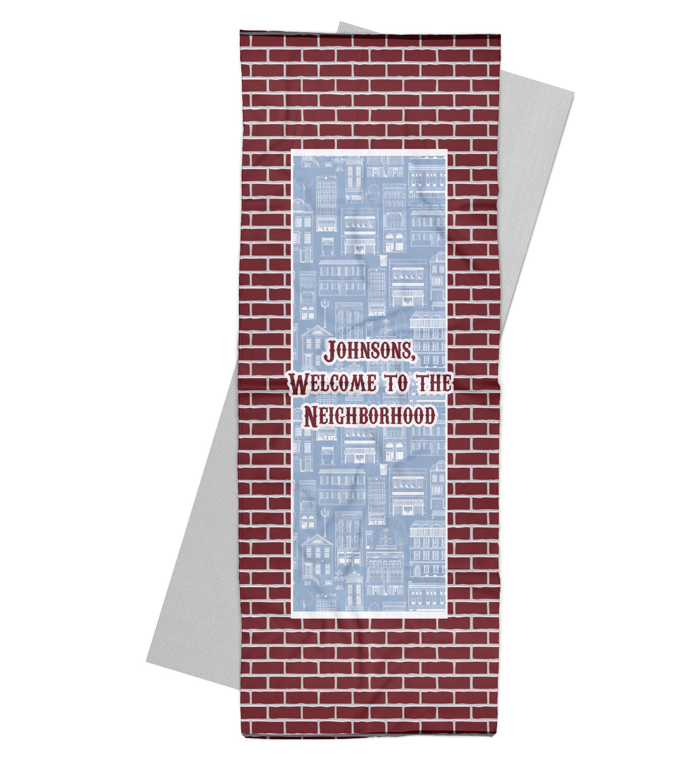 The design has two patterns with one surrounding the other in a square format. The inner pattern is a beautiful light-blue with white illustrations of houses and apartments. The outer design is a warm red brick pattern. The combination of these two patterns makes for a very friendly feeling design. The personalization goes directly in the middle of the inner design. The coordinating pattern has a fun colored graphic of a block of apartments and a place for text underneath.