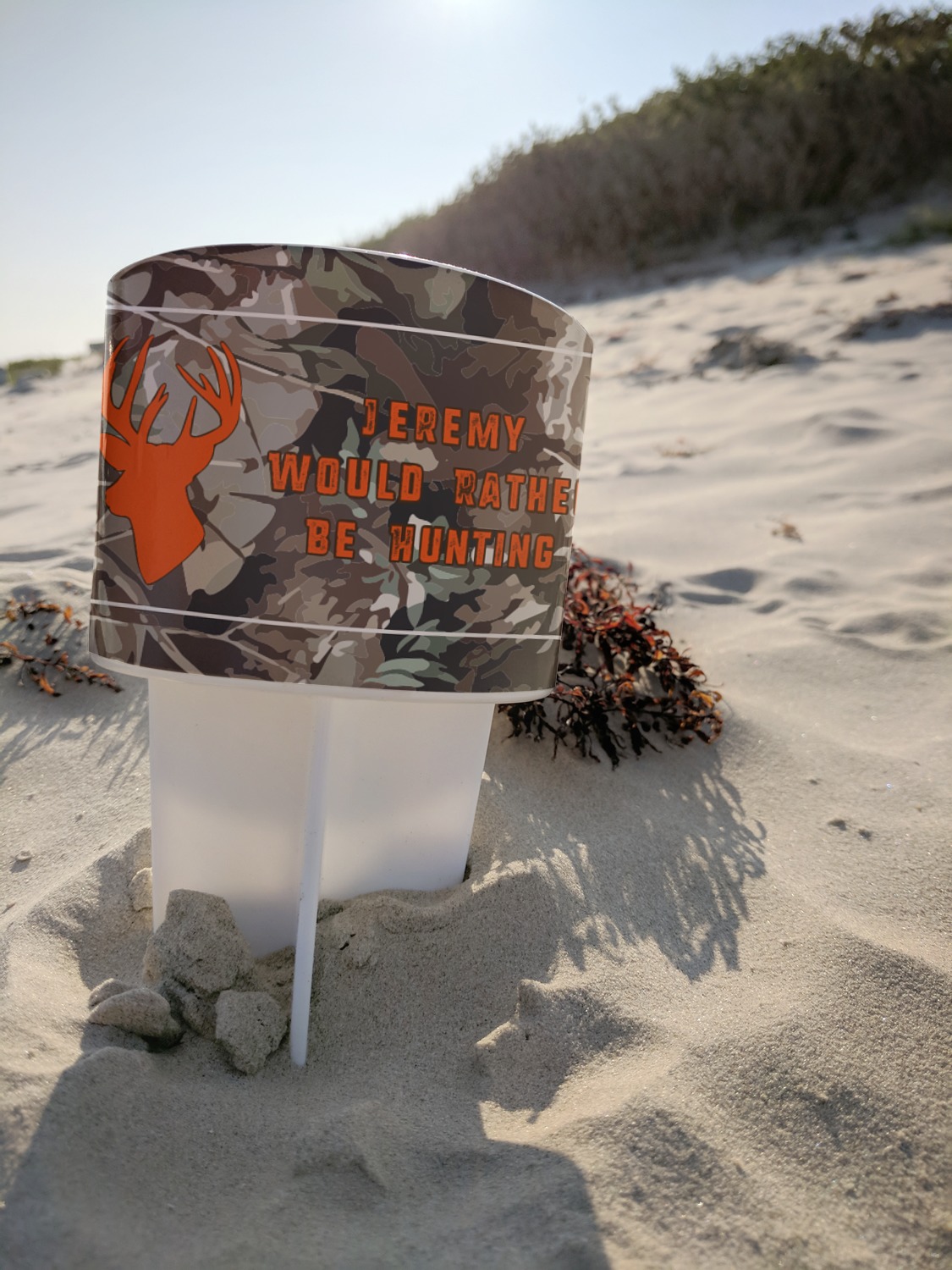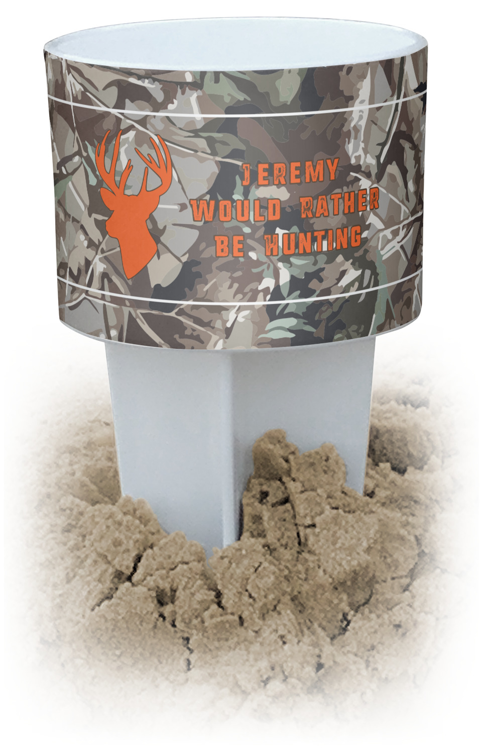This cup holder has a large stake at its bottom that anchors it to the sand or ground below, while the cup holder rests above the stake. The entire drink holder is made of durable plastic and displays your customization around the cup holder portion. We sell these personalized beach spikers in two different colors: black and white.