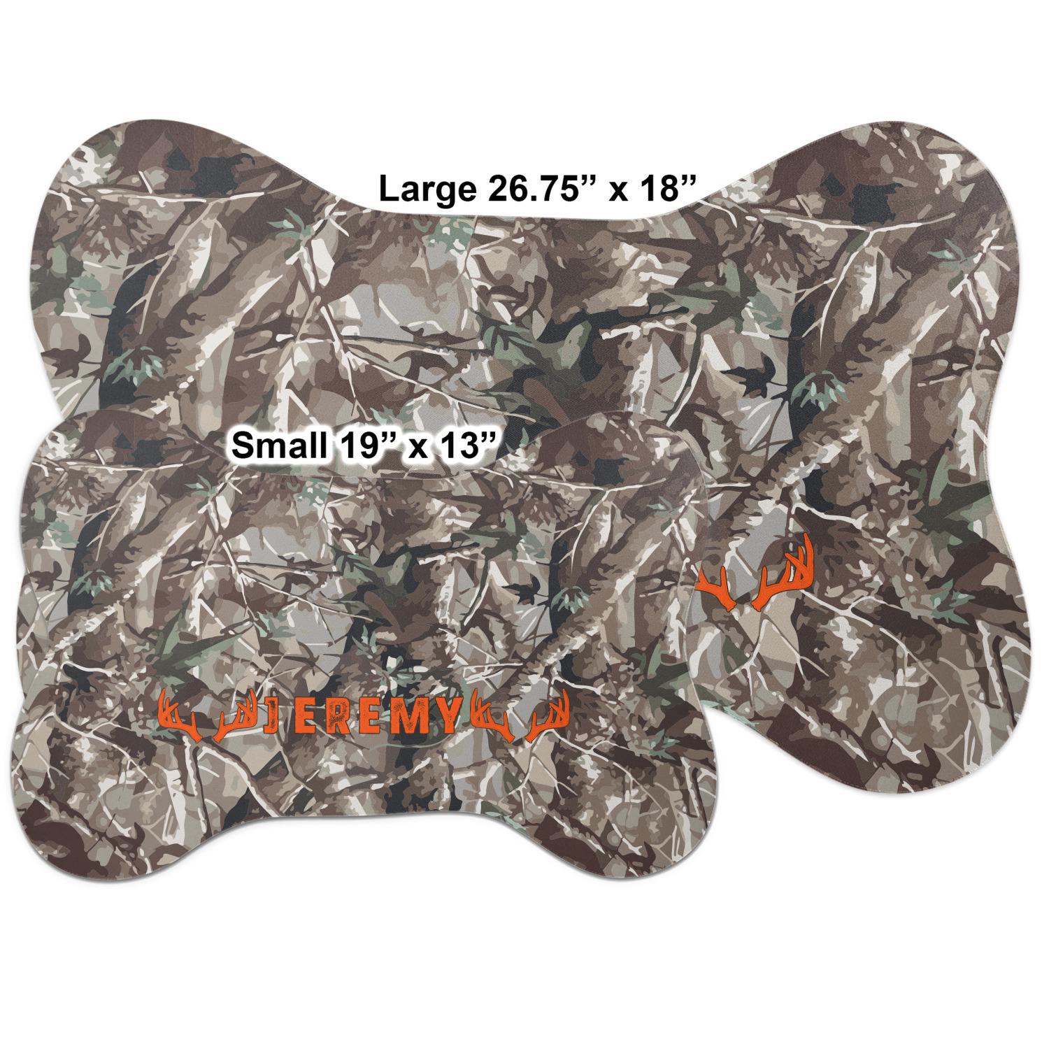 The top of this mat displays your custom design, as it is printed on polyester. To prevent slippage, the underside of the mat is made of rubber. We offer a small dog food mat, suitable for smaller dogs and a large dog food mat for bigger breeds. The small dog food mat is approximately 19 by 13 inches, while the large dog feeding mat measures at approximately 26.75 by 18 inches. Both personalized mats are ideally sized to fit two dog bowls.