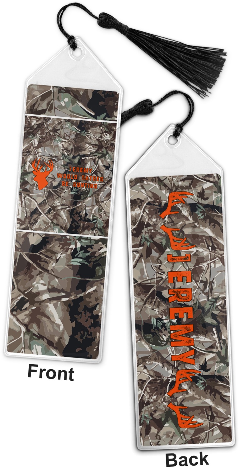Your personalized bookmark is made of a sturdy, clear vinyl, and is approximately 7.5" x 2.25". We display your personalization on vinyl inserts that are placed on both sides. Accompanying each book marker is a black, fringe tassel that attaches to the reinforced, triangular header.