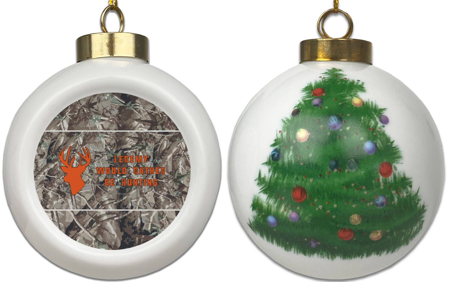 Our Christmas ornaments are a unique ceramic ball shape with a twist as it has a flat face to display your custom design! Select from one of our two design types - Christmas Tree or Poinsettia Garland - to adorn the curved back of your personal design. Each ornament measures 3H x 2.5W x 2D accompanied with a gold string accent for finishing touches to hang on your beautiful Christmas tree!