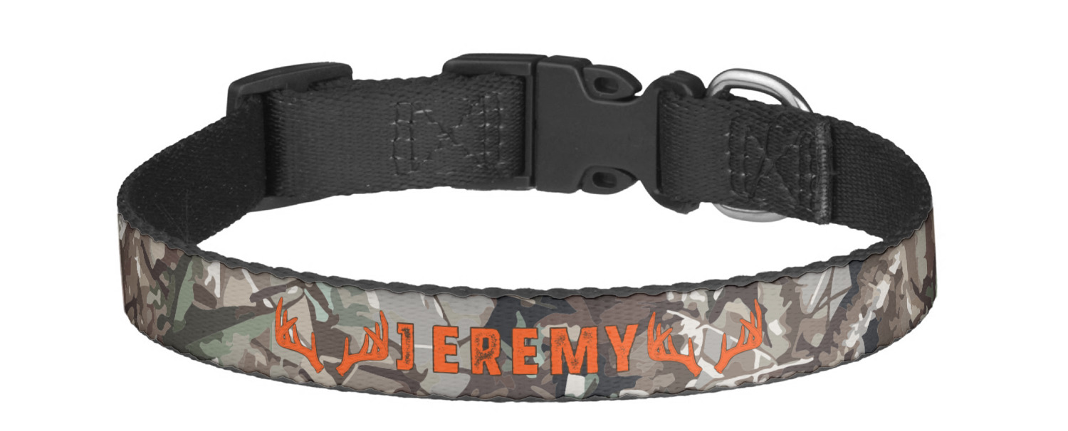 This sturdy collar, made from a durable nylon weave, will outlive your dog's episodes of excited tugging and pulling. Courtesy of its thick plastic buckle and adjuster, this collar is adjustable and accommodating of any dog. Structurally, the collar is a single piece of nylon weave that is sewn together, and features a solid metal loop where you can attach a leash or dog tag. We print and display your dog's name and pattern across the middle of the personalized dog collar.