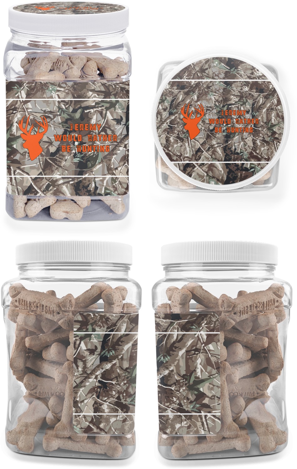 This half gallon jar, made from a sturdy plastic, is the perfect way to keep treats from any naughty pet paws, while still keeping them ready on hand for when your pup performs an impressive trick. This dog cookie jar features a screw-on, white lid that displays your personalized design on a vinyl sticker. We apply another customized sticker that wraps around the front and sides of the jar. Our dog treat jar also has indentations on the rear ends of the sides, which allows for convenient handling, and its square frame allows for easy storage.