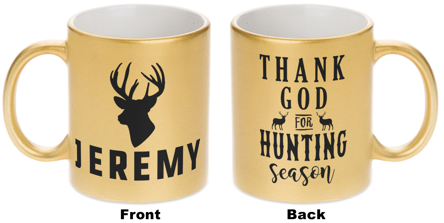 Our custom mugs are ceramic, which is great for keeping your tea or coffee warm! We offer two metallic mugs to personalize - Silver or Gold. Both styles hold around 11oz and have dimensions of approximately 3.75" x 3.5" x 4.75". Both the metallic mugs come in a matte finish and have glitter detailing to add a more pristine feel to the gold and silver base colors.