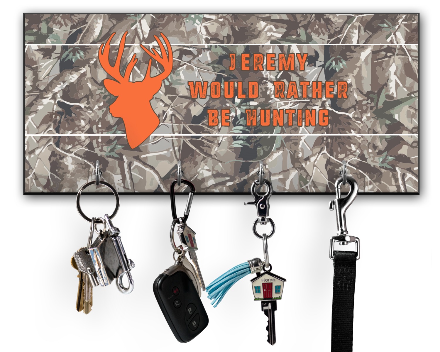 This 11" x 5" key hanger is made of sturdy wood and has four metal hooks lining the bottom. This is the perfect size for a family with several drivers. Not only can you hang keys on it though, but pet leashes and other small items. The board is black on the sides and back and is printed with the design of your choice on the front.