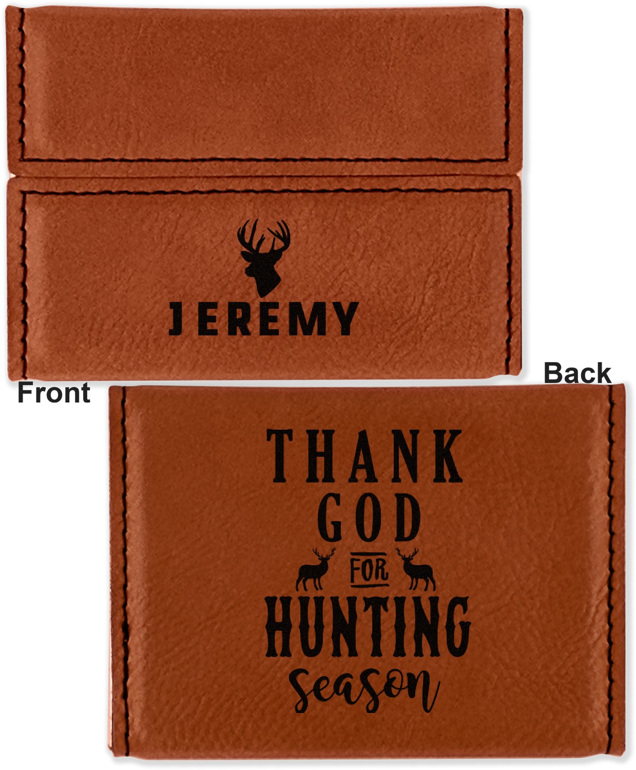 Your personalized design is laser engraved onto either the front, or the front and back of the card holder, depending on the model you purchase. Once engraved, the design will appear a darkened black against the cognac color of the leatherette.
