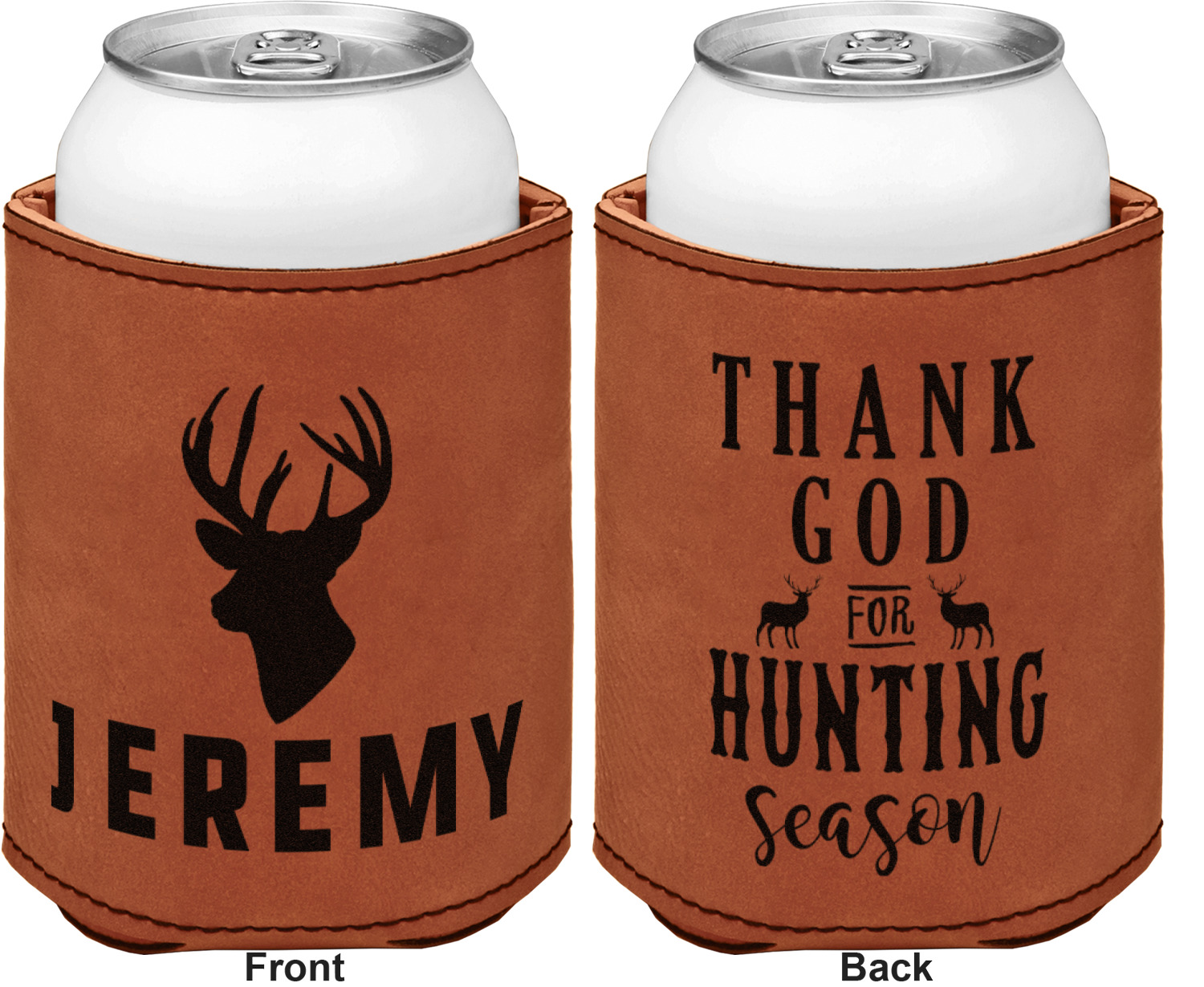 This can sleeve is made from a cognac-brown leatherette and stitched with a sturdy, black thread. A slim padding lines the inside of your can sleeve to allow for a better fit once your drink is inserted. The sleeve itself measures at 4 by 4.5 inches, allowing this custom can sleeve to accommodate most canned drinks. Your personalized design can be engraved on the front and back, or solely the front. When laser-engraved, your design appears as a black coloration which contrasts the leatherette nicely.