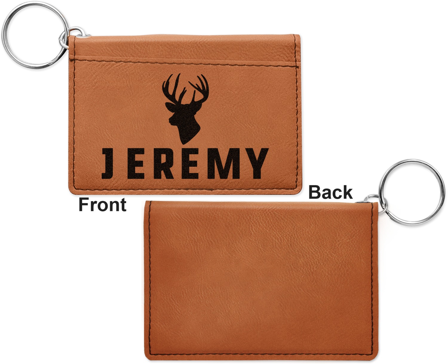 These ID wallet keychains features three pockets on the inside to accommodate your ID and your most frequently used cards. Another pocket occupies the front of the wallet's exterior, and can hold some cash or another card. The wallet is accompanied by a thick metal ring for easy attachment to a belt clip or purse. Each card holder keychain measures at 4.25 by 3 inches and is a beautiful, cognac, medium-brown shade. The personalized monogram, font, or graphic of your choosing is laser engraved into the surface of the wallet, creating a black imprint. We sell these ID wallets in two models: single sided and double sided engraving.
