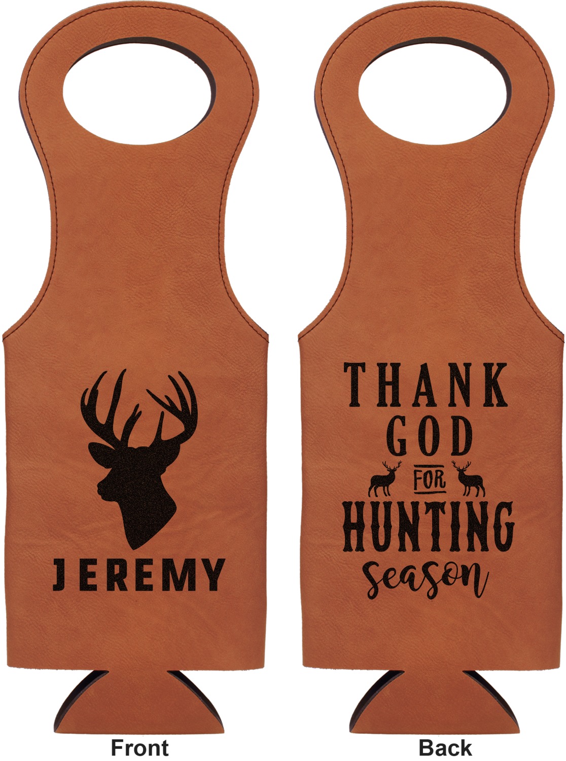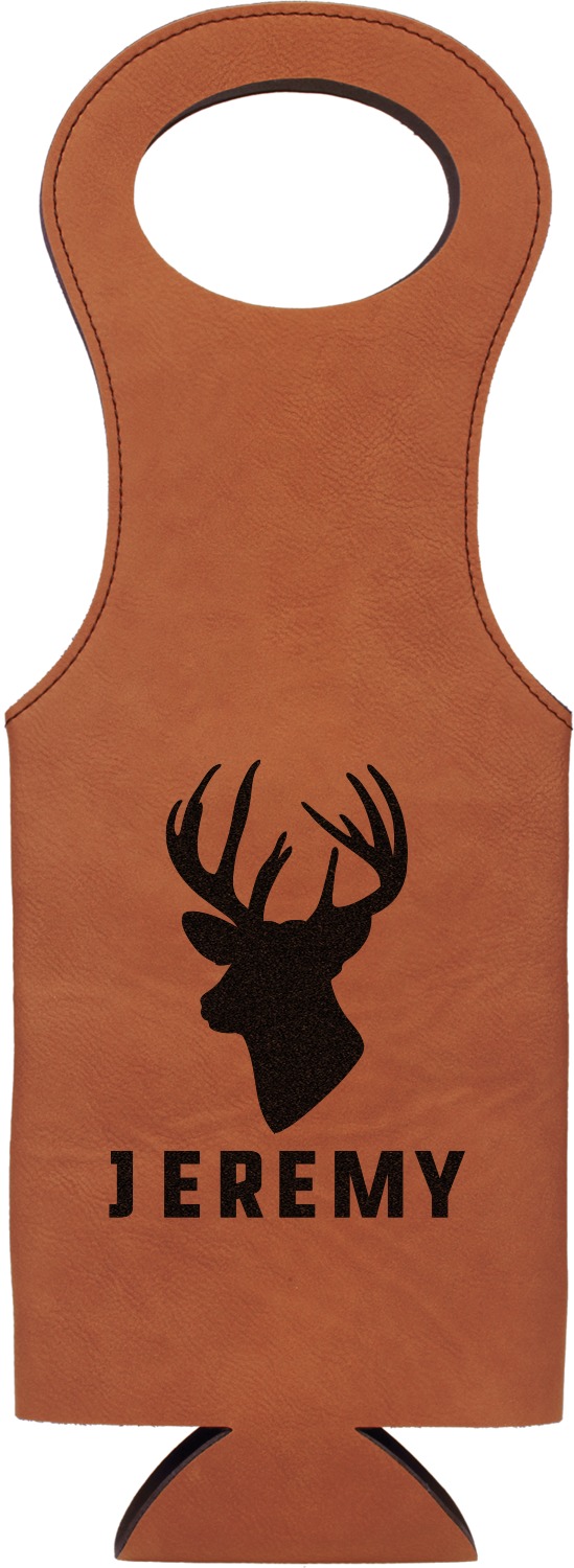 This wine carrier is made from a stunning leatherette, in a cognac-brown color. Strong, black stitching lines the sides of your wine bottle bag and provides extra durability. The interior is lined with a padded, black material to allow for a snug fit once your bottle is placed inside. At the top of this wine gift bag, you'll find two oval shaped handles that elegantly complements the rest of the bag's style. We provide you with the option of laser-engraving the front, or the front and back of your new personalized wine bag!