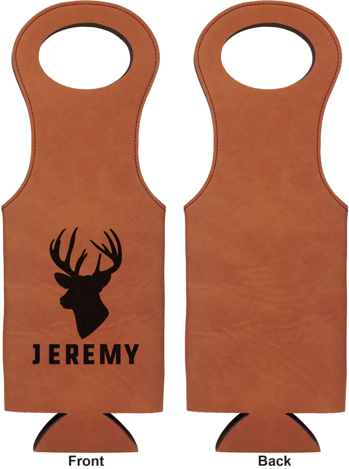 This wine carrier is made from a stunning leatherette, in a cognac-brown color. Strong, black stitching lines the sides of your wine bottle bag and provides extra durability. The interior is lined with a padded, black material to allow for a snug fit once your bottle is placed inside. At the top of this wine gift bag, you'll find two oval shaped handles that elegantly complements the rest of the bag's style. We provide you with the option of laser-engraving the front, or the front and back of your new personalized wine bag!