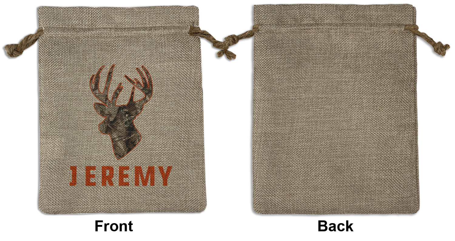 We sell our Burlap Gift Bags in 3 variant sized bags. Made with burlap polyester, each personalized bag can be secured with a twine drawstring pull. Your custom design is available to print on one side or both sides - completely up to you! The sizes of the bags measure approximately 4.5" x 6.5" for the smallest size, 6.5" x 8.0" for the medium size, and 6.5" x 13.5" for the large-sized bag.