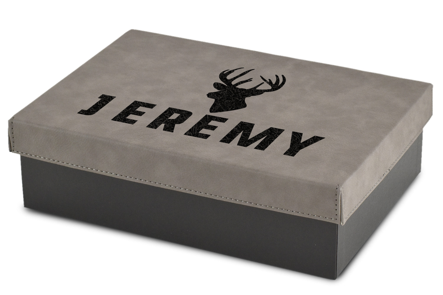 These gift boxes are available in 3 different sizes to accommodate various sized gifts. Available in gray as a neutral color for any occasion as well as to showcase your design boldly. Engraved with a laser this high quality paper board and faux leather gift box is unique and makes any gift stand out.