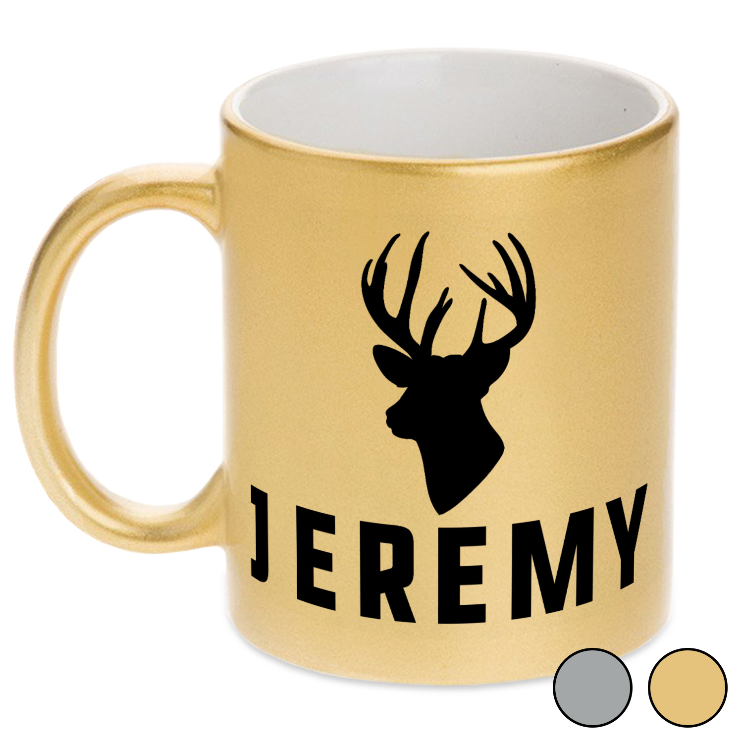 Our custom mugs are ceramic, which is great for keeping your tea or coffee warm! We offer two metallic mugs to personalize - Silver or Gold. Both styles hold around 11oz and have dimensions of approximately 3.75" x 3.5" x 4.75". Both the metallic mugs come in a matte finish and have glitter detailing to add a more pristine feel to the gold and silver base colors.