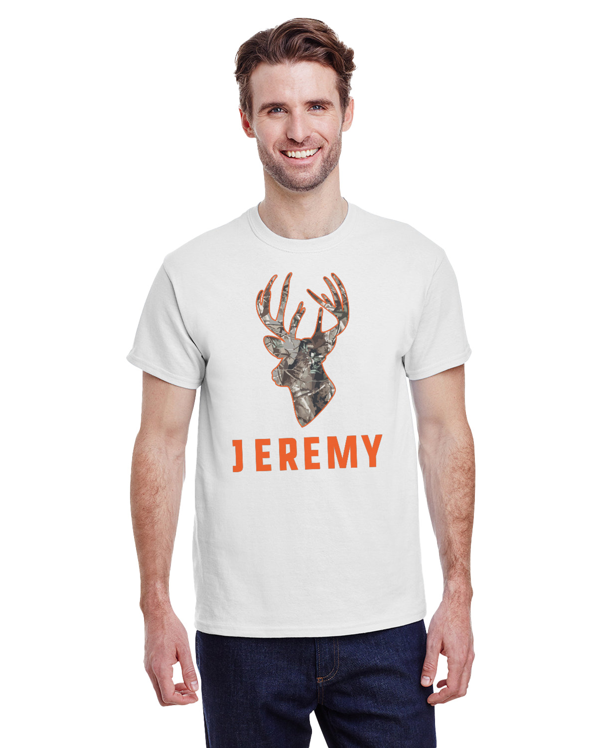 A grassy camo background is used for the perfect setting for this design idea. The background is all different shades of tans and browns. A bright orange is used for the deer head graphic and the grungy text that is used in this design. The bright orange pops perfectly like a safety vest in the woods.