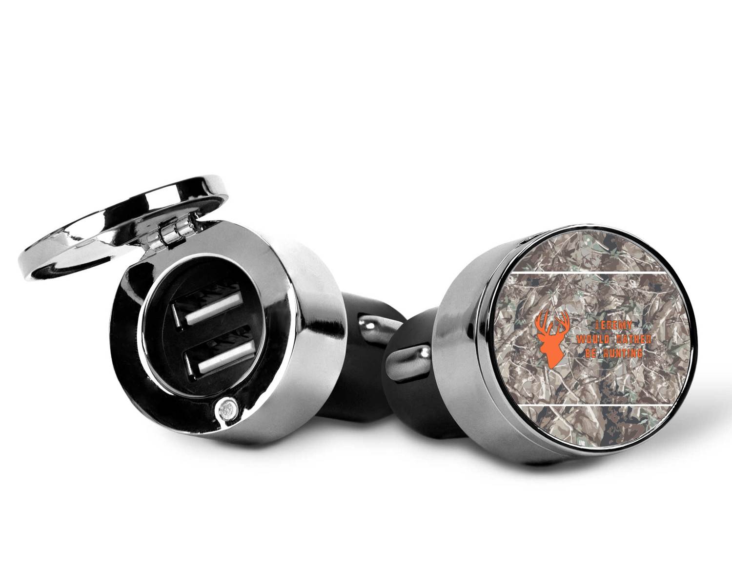 This car charger adapter converts your cars bland cigarette lighter into a decorative, personalized, and operational USB charging port. Made of solid, silver-plated metal, these chargers feature a flip-open lid that both displays your customized design and conceals two USB ports. The metal lid of the USB car charger adapter is 1.5" in diameter and seals due to a small, ingrained magnet on both the charger and its lid. The cigarette lighter insert, itself, is colored black.